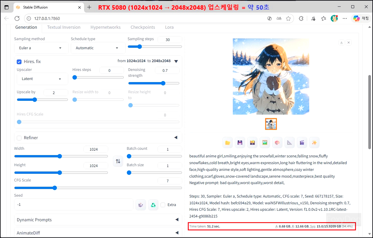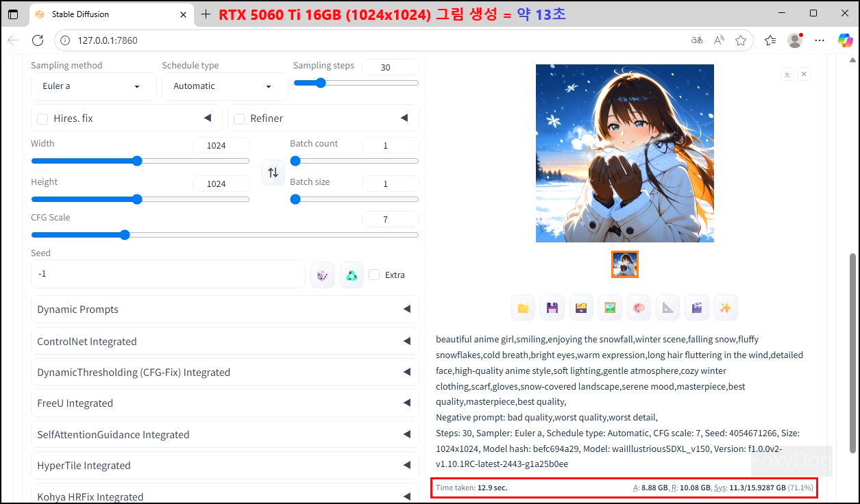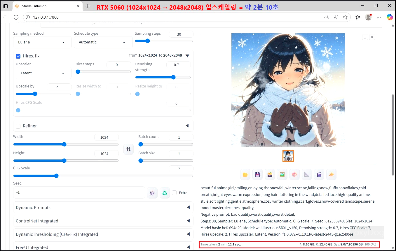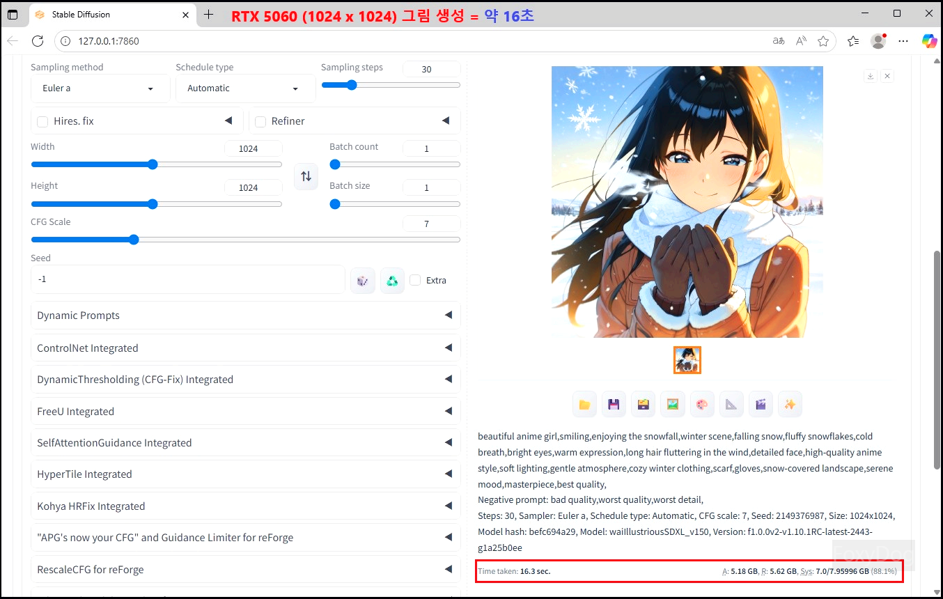 좀 더 정확한 비교를 하려면, RTX 5060 Ti 8GB 모델과 직접 테스트해 보는 것이 VRAM 차이를 체감하는 데 가장 확실한 방법일 것 같습니다. 단일 이미지 생성 정도에서는 큰 차이가 드러나지 않을 수 있지만, 업스케일링 과정에서는 그 격차가 명확하게 나타납니다.
