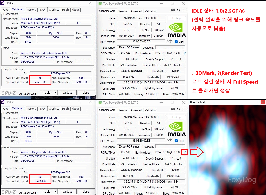 테스트를 진행하다 보니, BIOS나 소프트웨어 환경에 따라 PCIe 정보가 간혹 오탐으로 표기되거나 실제와 다르게 표시되는 경우가 있는 것 같습니다. PCIe는 기본적으로 전력 절약을 위해 유휴(IDLE) 상태에서는 링크 속도를 자동으로 낮추는 방식이 정상 동작이며, 3DMark, Render Test, 게임 등을 실행해 로드가 걸리면 그때 비로소 Full Speed로 올라가는 구조라고 합니다. 만약 링크 속도가 즉시 올라가지 않는 상황이라도,「장치관리자 → 디스플레이 어댑터 → 그래픽 카드 속성 → PCI 현재 링크 너비/속도」 항목에서 PCIe 4.0 또는 5.0으로 표기되고 있다면 정상으로 보셔도 무방합니다.