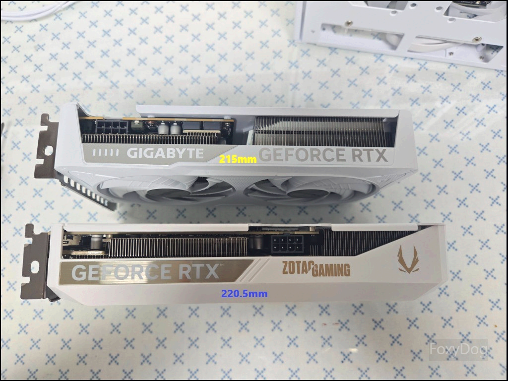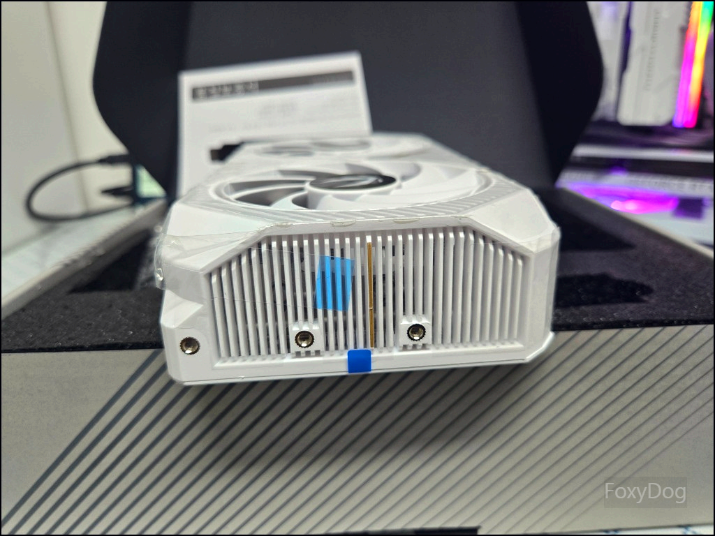 제품 크기는 2슬롯, 가로 220.5mm, 세로 120.3mm에 불과해, 같은 5060 Ti 라인업 중 기가바이트 208mm~215mm 모델 다음으로 짧은 편에 속합니다. 덕분에 SFF(ITX) 케이스에서도 충분히 활용 가능한 사이즈입니다. 개인적으로 끝 라인이 엣지 형태로 마감된 디자인은 선호하지 않지만, 라이저 킷 없이 메인보드에 수평 장착하는 방식이라 조립 후 외관을 보면 GEFORCE RTX 로고가 메탈 질감으로 강조되어 있고, 조텍 로고 역시 과하지 않아 전체적인 완성도는 상당히 깔끔했습니다. 작은 사이즈임에도 90mm 블레이드 팬 두 개가 탑재되어 있으며, 메탈 백플레이트까지 적용되어 쿨링 효율과 구조적 안정성도 잘 확보된 모델로 보입니다.