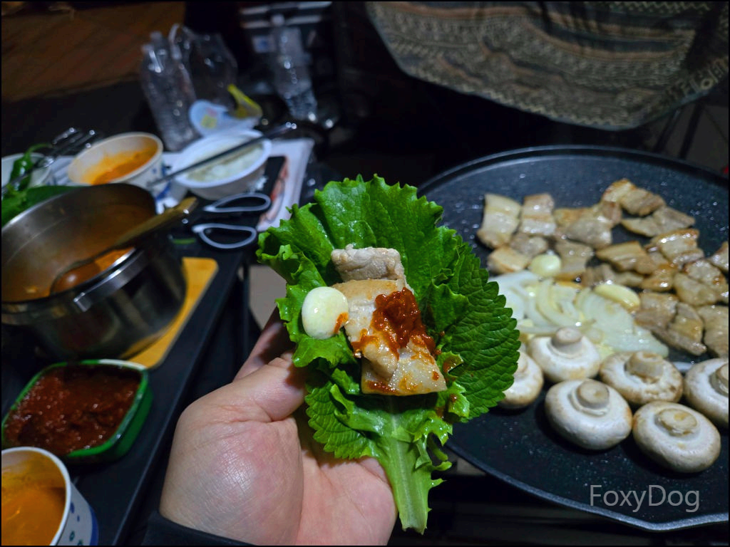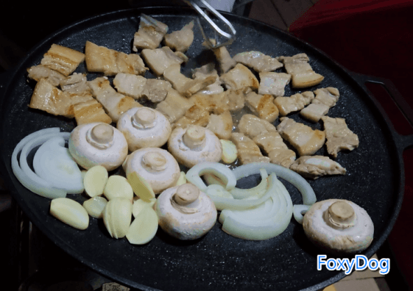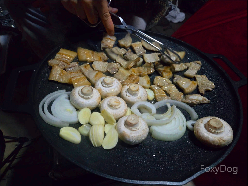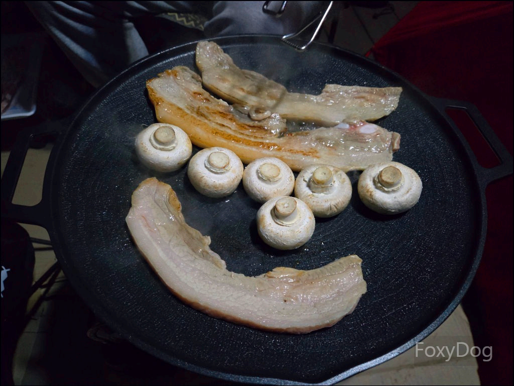 아... 포스팅하면서 사진을 다시 보다 보니 또 먹고 싶어 져서 입에 자동으로 침이 고인다. 이번에는 출발 전에 미리 고기를 준비하고 야채 손질도 전부 해두어서, 저녁 만찬 준비를 빠르게 끝낼 수 있었다. 정석대로 두꺼운 삼겹살에, 저번에 빠뜨렸던 양파와 양송이버섯, 그리고 손질해 둔 마늘을 얇게 썰어 그대로 구웠다. 삼겹살에서 나온 기름에 양파와 마늘을 함께 굽는 순간, 이 조합은 언제나 옳다.