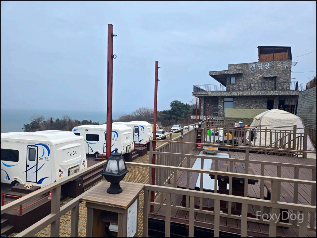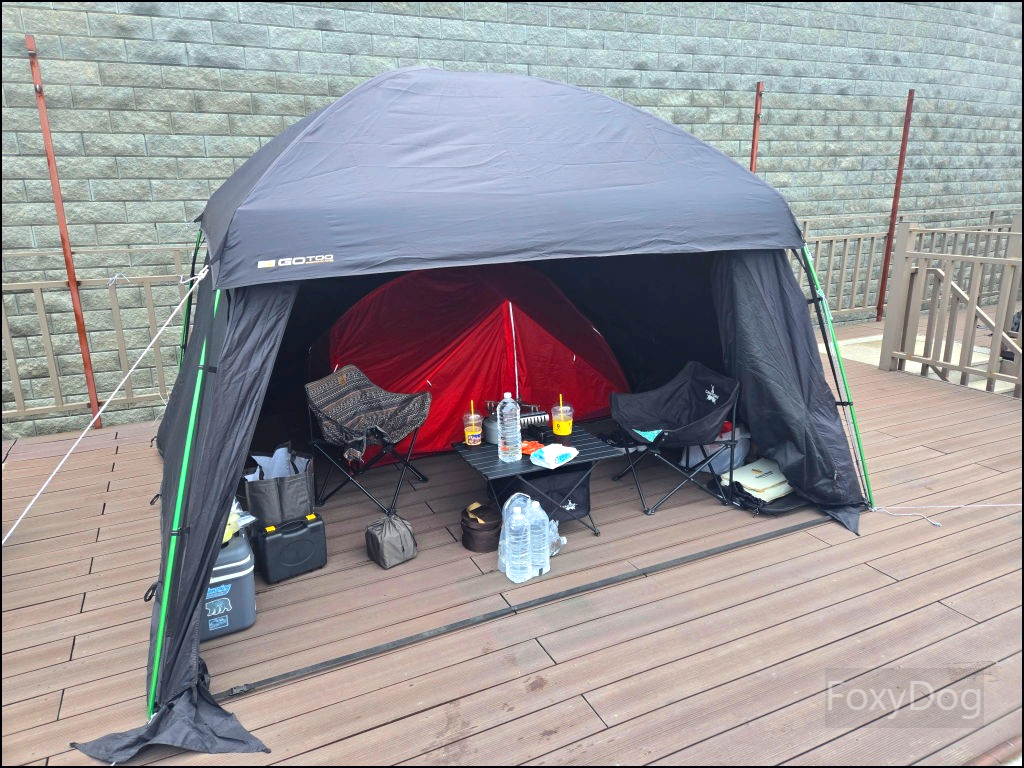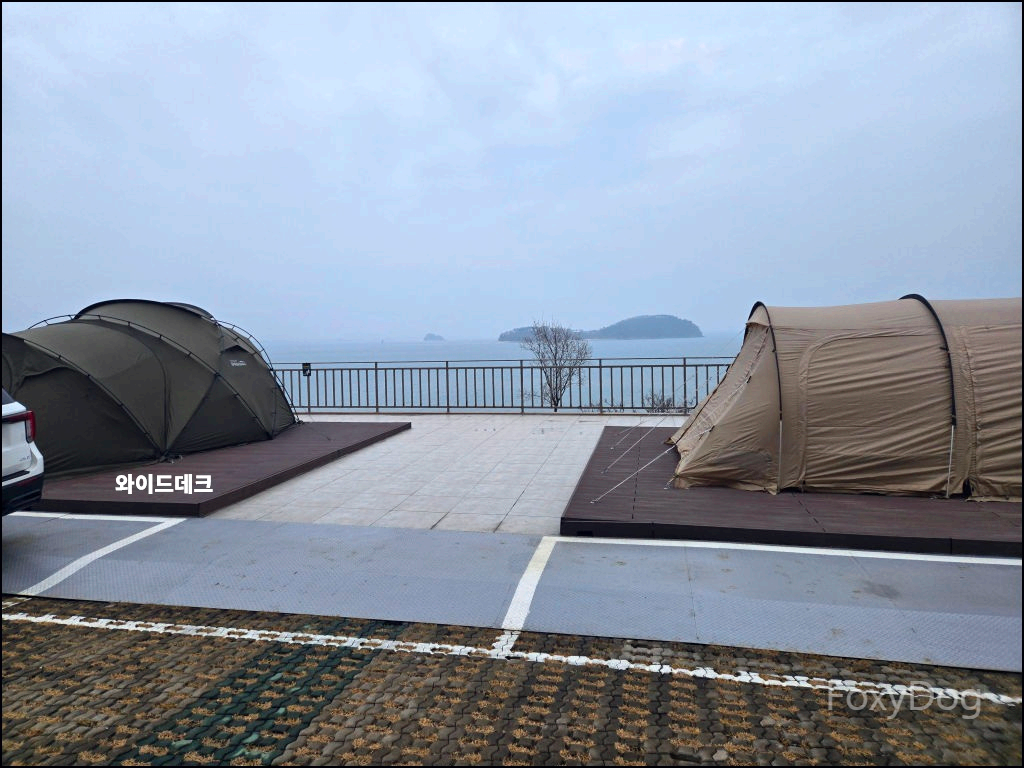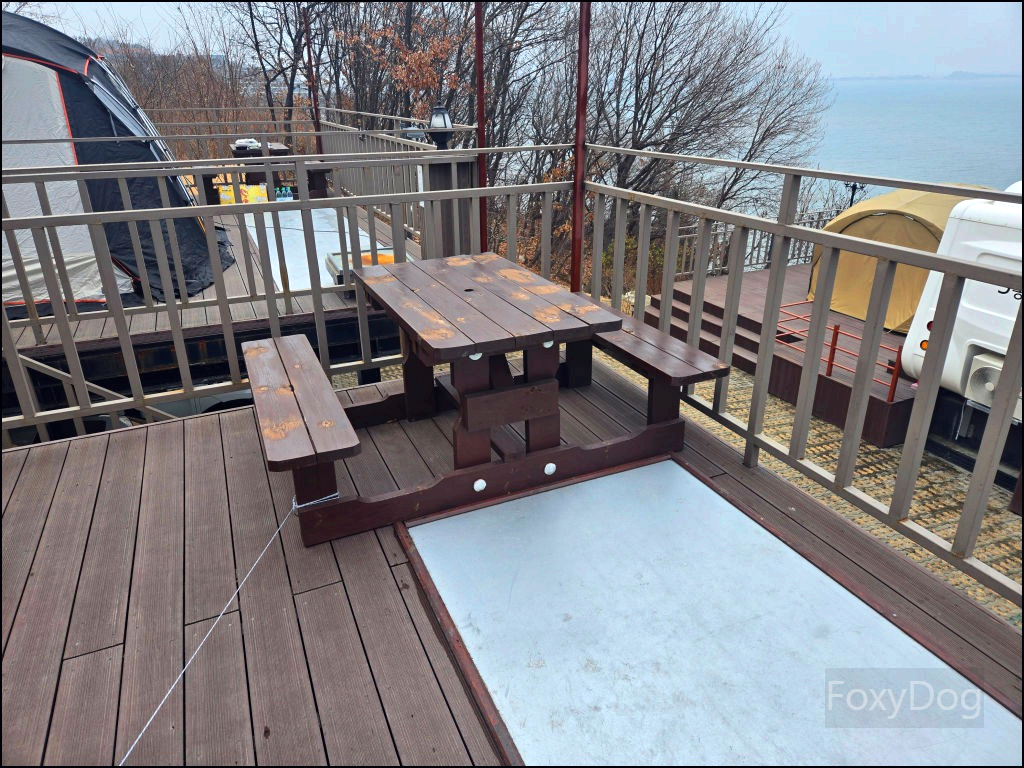 이곳은 특이하게 복층 형태의 데크로 되어 있어, 아래쪽에 차량을 주차할 수 있기 때문에 짐을 옮기는 데 큰 불편함이 없다. 다만 복층 데크는 지정석이 아니라 선착순이라, 도착한 순서대로 원하는 자리를 잡는 방식이다. 맨 끝자리를 노렸지만, 비교적 일찍 도착했음에도 이미 선점한 팀이 있어 아쉽게 포기했다.