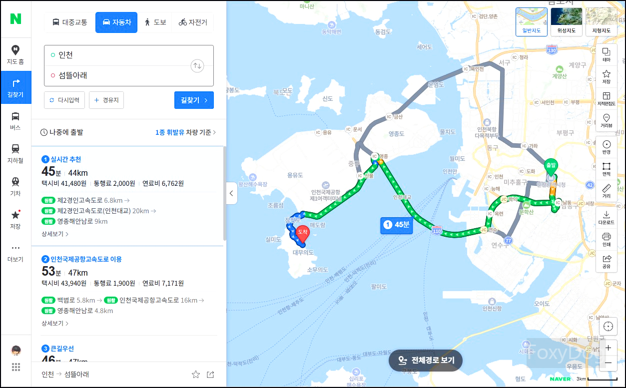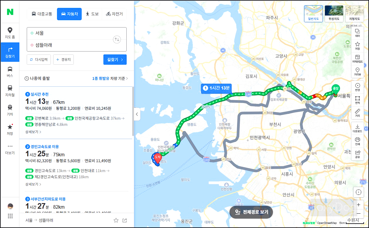 서울(시청) 기준으로 교통량 교통량을 고려하면 약 「1시간 30분」 정도 걸리는 거리다. 인천국제공항고속도로만 잘 타고 올라가면 이후부터는 크게 막히는 구간 없이 이동할 수 있다. 인천(시청)에서 출발하는 경우에는 인천대교를 이용하면 「1시간」 내로 조금 더 빠르게 접근이 가능하다.