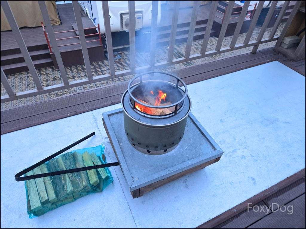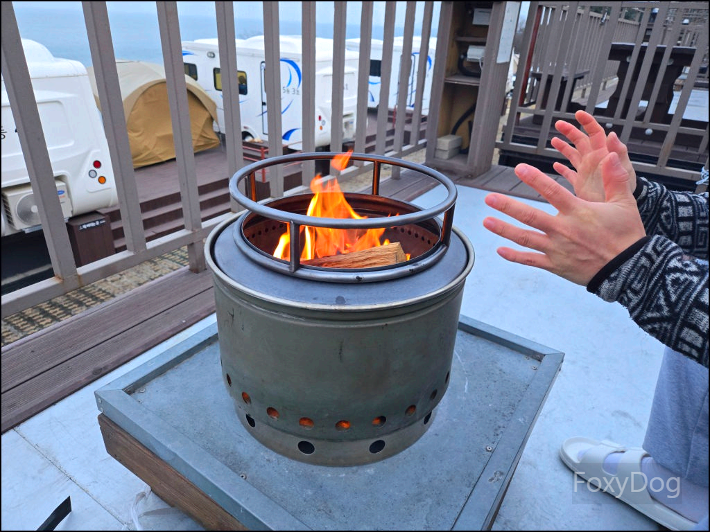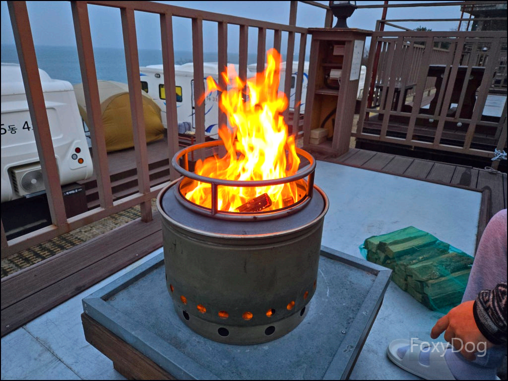 보통 오후 6시쯤 불을 피우기 시작하면 참나무 장작 10kg을 전부 쓰지 못하고 남는 경우가 많은데, 이날은 달랐다. 매서운 바닷바람이 쉴 새 없이 몰아치다 보니 화로대 안으로 공기가 너무 잘 통해서 화력이 장난이 아니었다. 결국 장작 10kg(15,000원)을 추가로 구매해 모자람 없이 계속 넣어줬고, 그렇게 하니 오후 9시까지 불이 꺼지지 않는, 마치 영원히 타오르는 불꽃같은 광경이 연출됐다. 장작이 모두 전소된 뒤에도 남은 숯에 공기가 끊임없이 유입되면서, 마지막에는 흡사 지옥불처럼 보일 정도였다. 이 화력에 밤이나 호박고구마를 쿠킹 호일에 싸서 구웠다면 최고의 술안주가 되었을 것 같다.