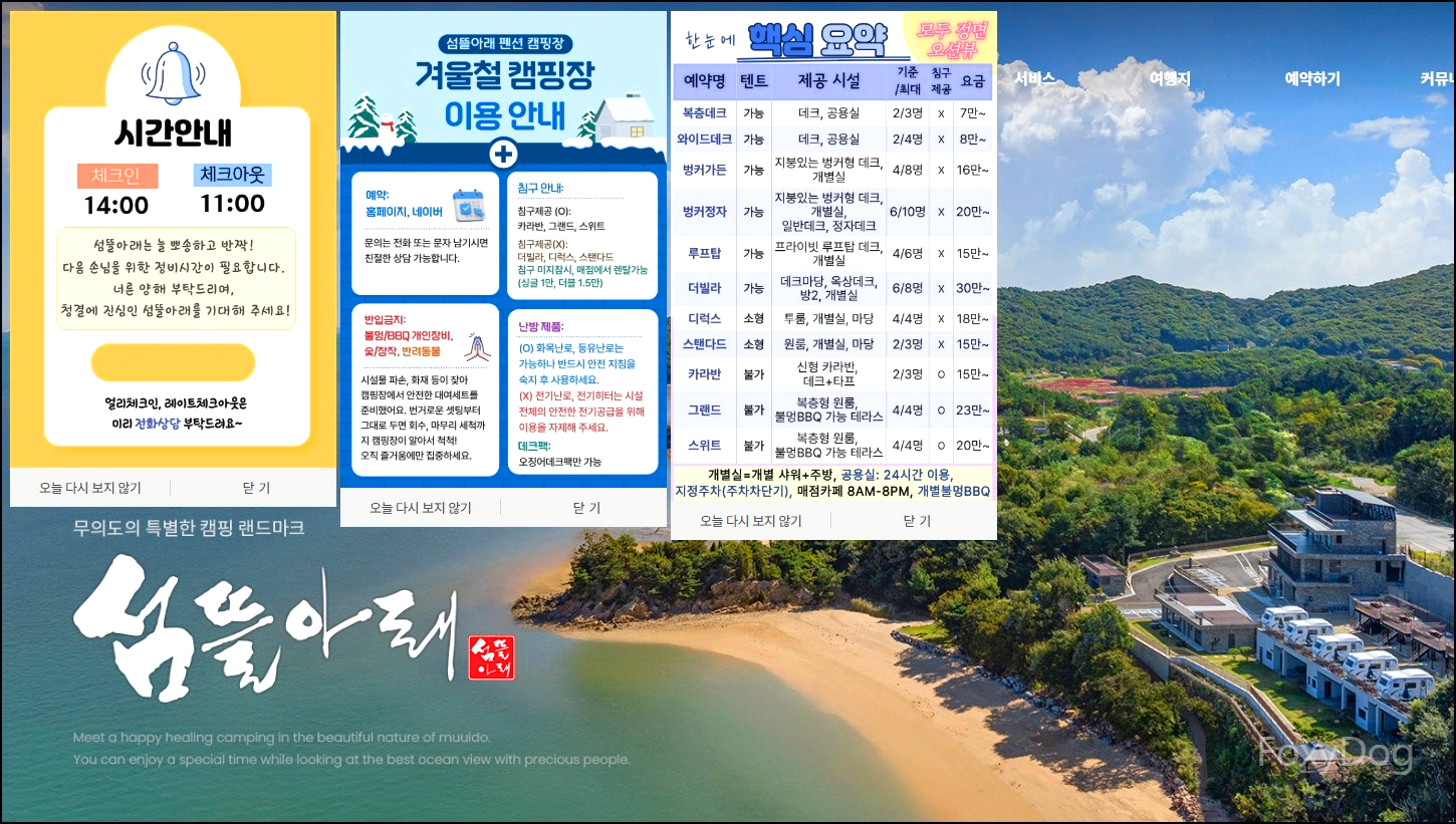 이번에 갈 곳은 3주 전부터 미리 알아보고 체크해 둔 캠핑장으로, 인천 중구에 속한 무의도 섬에 위치해 있다. 네이버 평도 전반적으로 괜찮았고, 공식 홈페이지를 확인해 보니 시설이 깔끔하고 편의시설도 잘 갖춰져 있어 큰 고민 없이 예약을 진행했다.