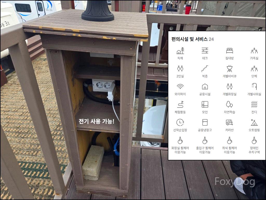 오메... 따뜻한 거 (◞˘◡˘)◞🔥 불멍을 하다 보니 손과 얼굴로 따뜻한 열기가 올라오기 시작했고, 정신이 몽롱해지면서 자연스럽게 불멍에 빠져들게 된다. 그런데 불멍을 하던 도중, 건너편 조명등 아래에 스위치 버튼이 있고 전기 콘센트처럼 보이는 것이 보여서 자세히 확인해 보니... 아니! 전기를 사용할 수 있었던 것이었다. 분명 편의시설 안내에는 그런 내용이 없었잖아요. (;︵;)