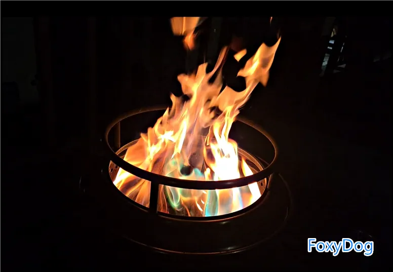 ※ 오로라 착화제는 가루, 젤, 고체 등 다양한 형태가 있다. 장작불 위에 가루 형태로 뿌려 사용하는 방식도 있지만, 우리는 봉지째 넣는 방식으로 사용했다. 여러 금속 염이 혼합되어 있어 연소 시 유해 물질이 발생할 수 있으므로, 절대 밀폐된 공간에서는 사용하지 않도록 주의해야 한다. 특히 아이들이 있는 경우에는 손이 닿지 않도록 하고, 반드시 충분한 거리에서 관람하도록 안전을 확보하는 것이 중요하다.