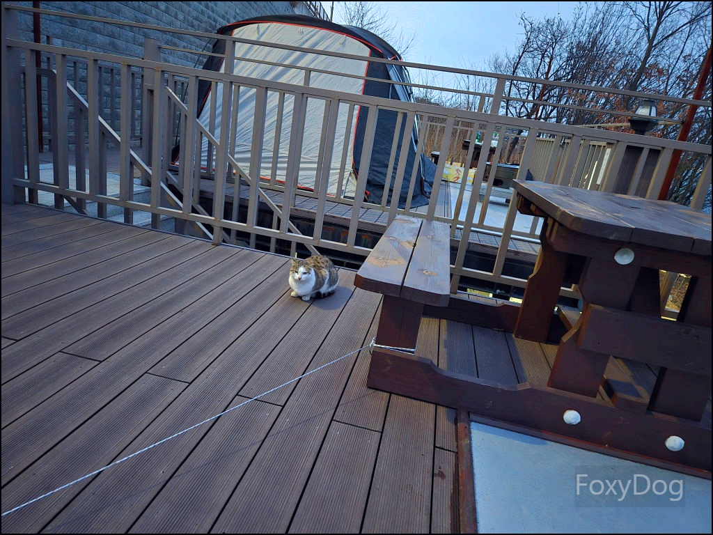 오후 6시쯤 되니 금세 해가 저물어 가면서 체감 온도가 더 떨어지는 게 느껴졌다. 그때쯤 여기저기서 야옹거리는 고양이 울음소리가 들리길래 옆을 봤더니, 고용이 한 마리가 바로 데크 옆으로 다가와 있었다. 너도 불멍 하러 온 거냐고 속으로 물어봤지만, 아직 저녁 준비를 시작하지 않아 줄 수 있는 먹을 건 없었다.