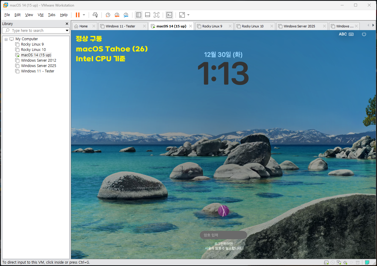 기존에 사용하던 macOS 환경은 macOS Sonoma(소노마, 14) → Sequoia(세쿼이아, 15) → Tahoe(타호, 26) 순으로 OS를 새로 설치하지 않고 기존 환경을 유지한 상태에서 계속 업데이트하는 방식으로 테스트해 왔습니다. 그 결과, Intel CPU 기준에서는 현재까지 정상적으로 작동하고 있는 것을 확인할 수 있었습니다. 반면 AMD CPU는 공식적으로 지원되지 않습니다. VMware 구버전에서는 우회 방식으로 구동이 가능했던 사례들이 있긴 했지만, 최신 VMware 버전에서도 동일한 방식이 가능한지는 추가 테스트가 필요할 것으로 보입니다.