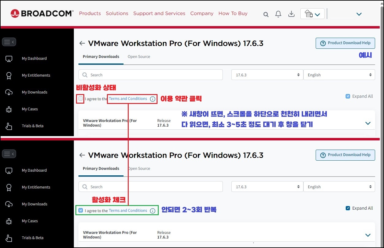 처음 화면에서는 해당 항목이 비활성화 상태로 표시됩니다. 「Terms and Conditions(이용 약관)」을 클릭하면 별도의 창이 하나 열리는데, 이때 스크롤을 천천히 하단까지 내려 전체 내용을 읽은 뒤, 약 3~5초 정도 대기한 후 창을 닫아주시면 됩니다. 정상적으로 인식되면 체크 박스가 활성화되며, 체크 후 Download 버튼을 클릭하시면 됩니다. 만약 활성화되지 않는 경우에는 2~3회 정도 반복해서 시도해 주시기 바랍니다.