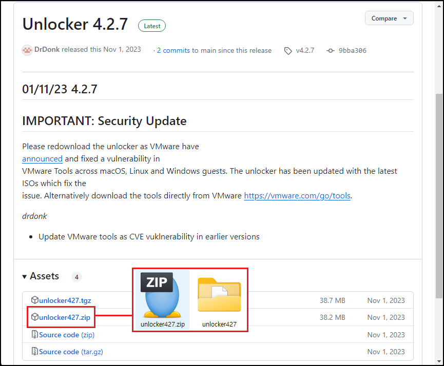 ② 2026-01-01 작성 기준 2023년 11월 1월에 출시한 「Unlocker4.2.7」이 마지막 버전입니다. 필자는 Windows에 설치를 하므로「.ZIP」로 다운로드하였습니다. 설치 테스트는 VMware Workstation Pro 25H2「25.0.0.24995812」에서 진행하였습니다.