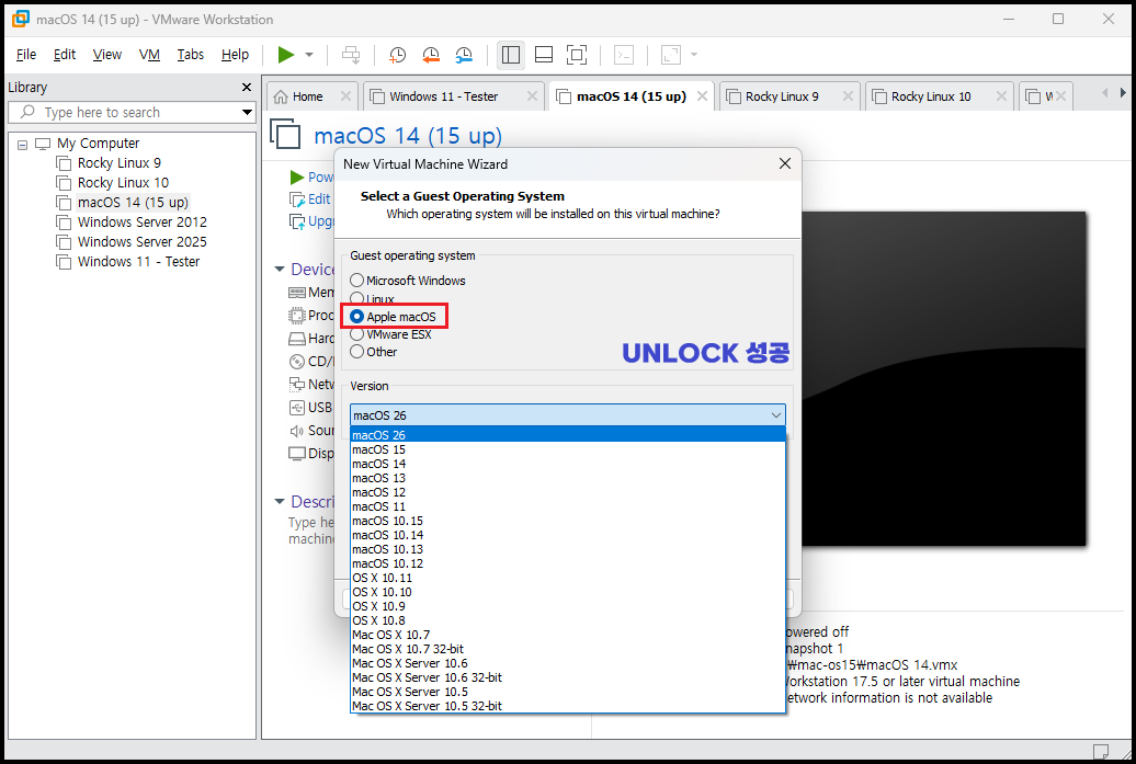 VMware Workstation 프로그램이 실행되어 있으면 패치가 중지됩니다. 실행되어 있다면 프로그램 중지 후에 다시 관리자 권한으로「unlock.exe」을 실행합니다. 정상적으로 패치가 되면 「Patching Complete!」 명령 프롬프트가 떨어집니다. 그리고 다시 프로그램을 실행하면 macOS가 Unlock이 되며 리스트에서 나오게 됩니다.