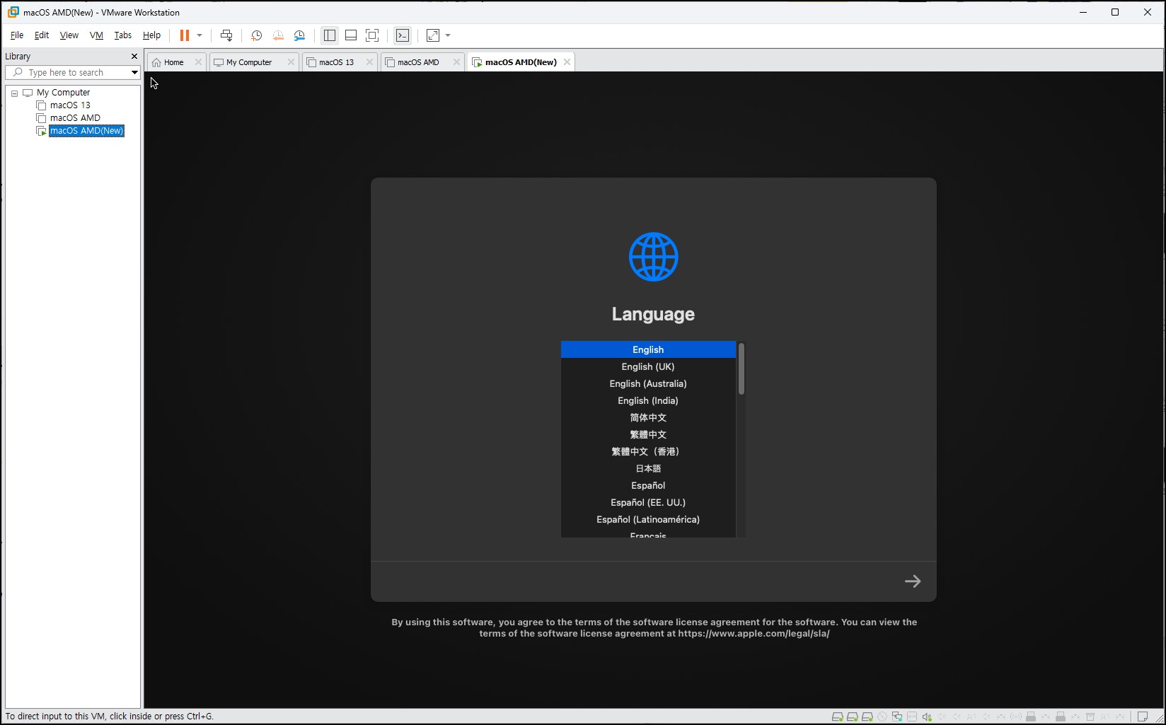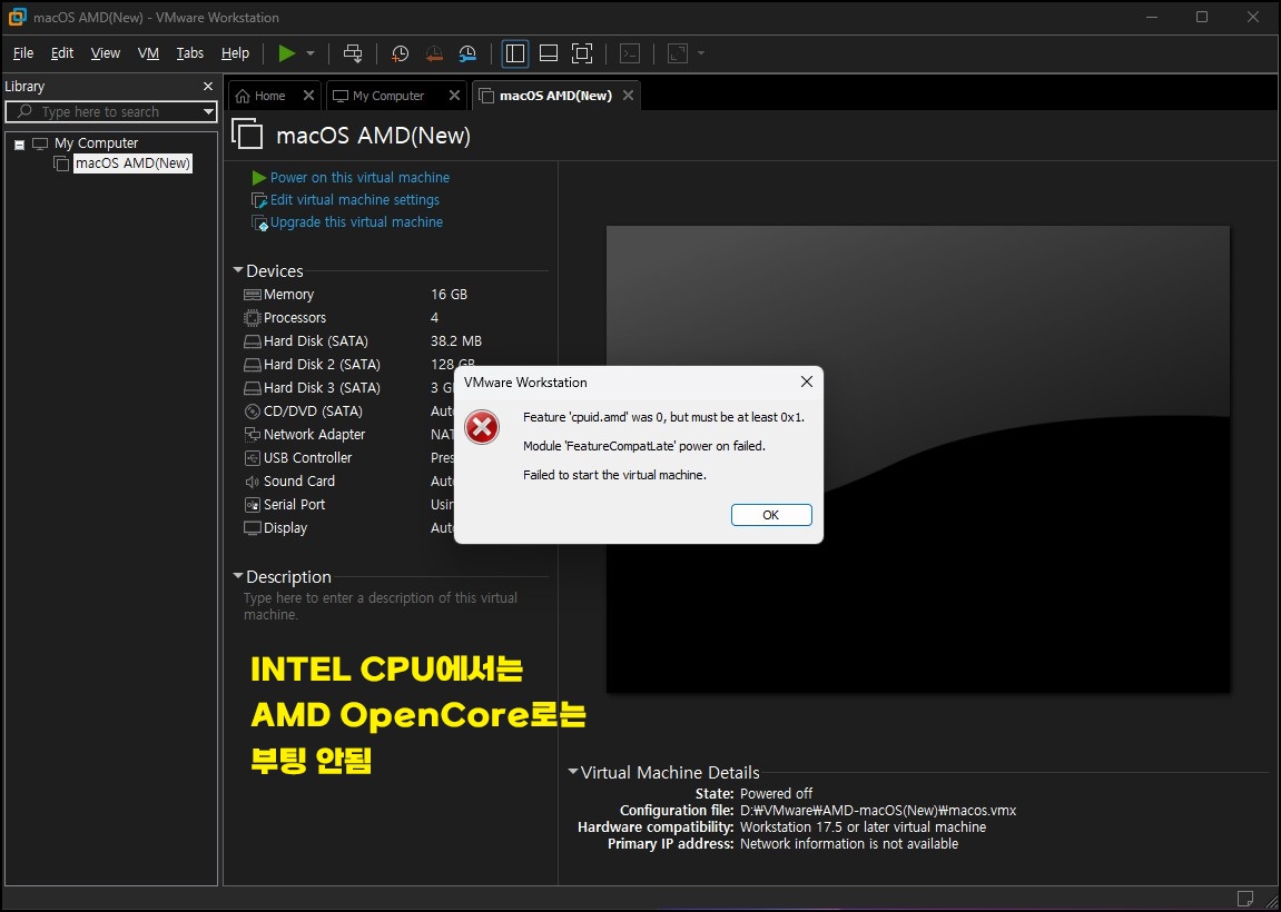 또 한 가지 중요한 부분은, 이번 방식은 OpenCore 기반 부트로더 방식이기 때문에 예전처럼 VMware Unlocker를 반드시 사용할 필요가 없어졌습니다. 만약 인텔 CPU라면 OC4VM 소스에서 INTEL 폴더만 복사 후 똑같이 진행하면 되지 않을까 합니다. 이 부분은 추 후 테스트를 해보겠습니다.