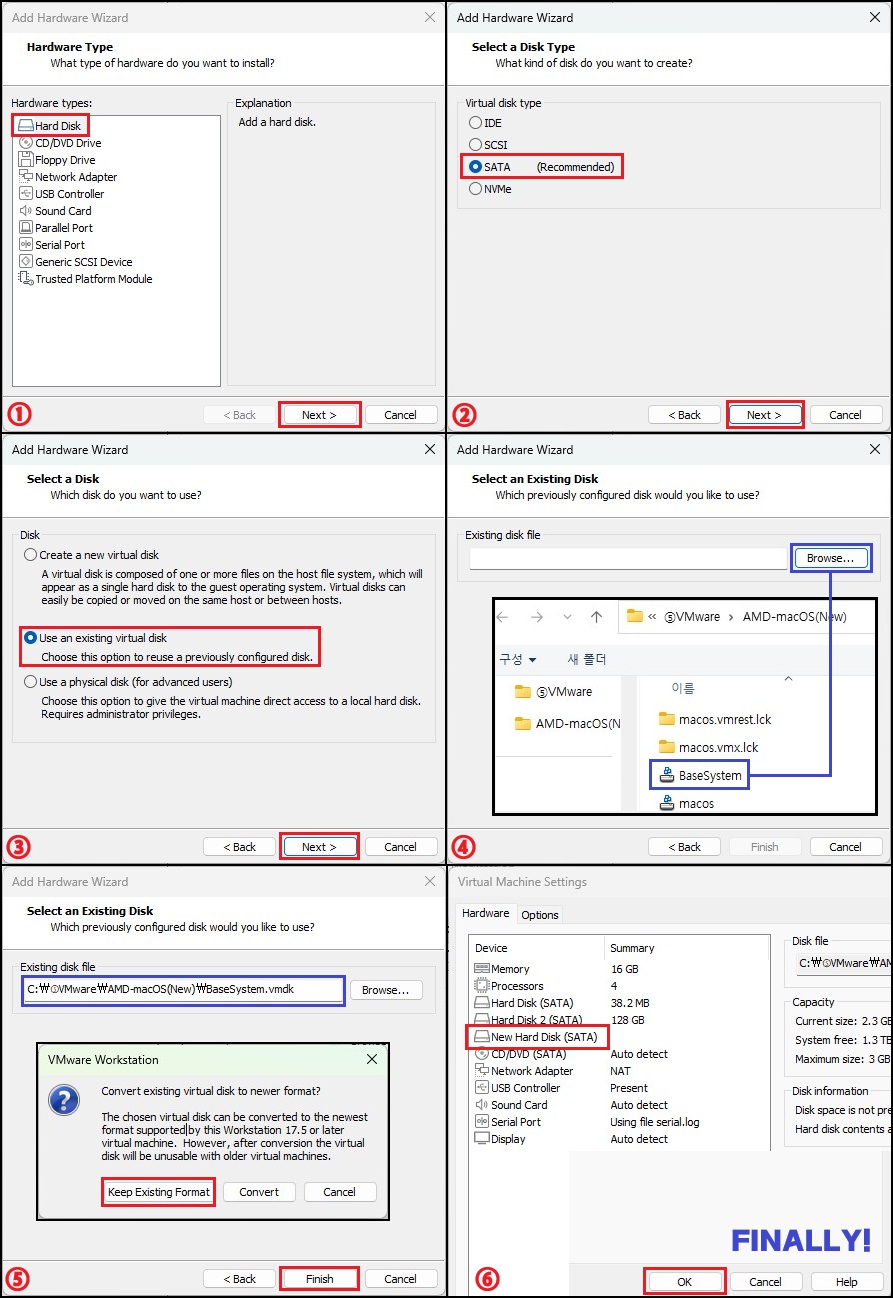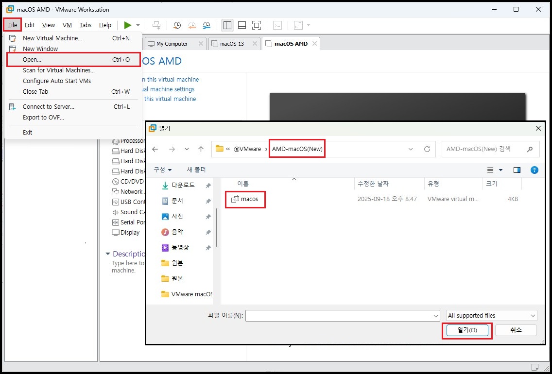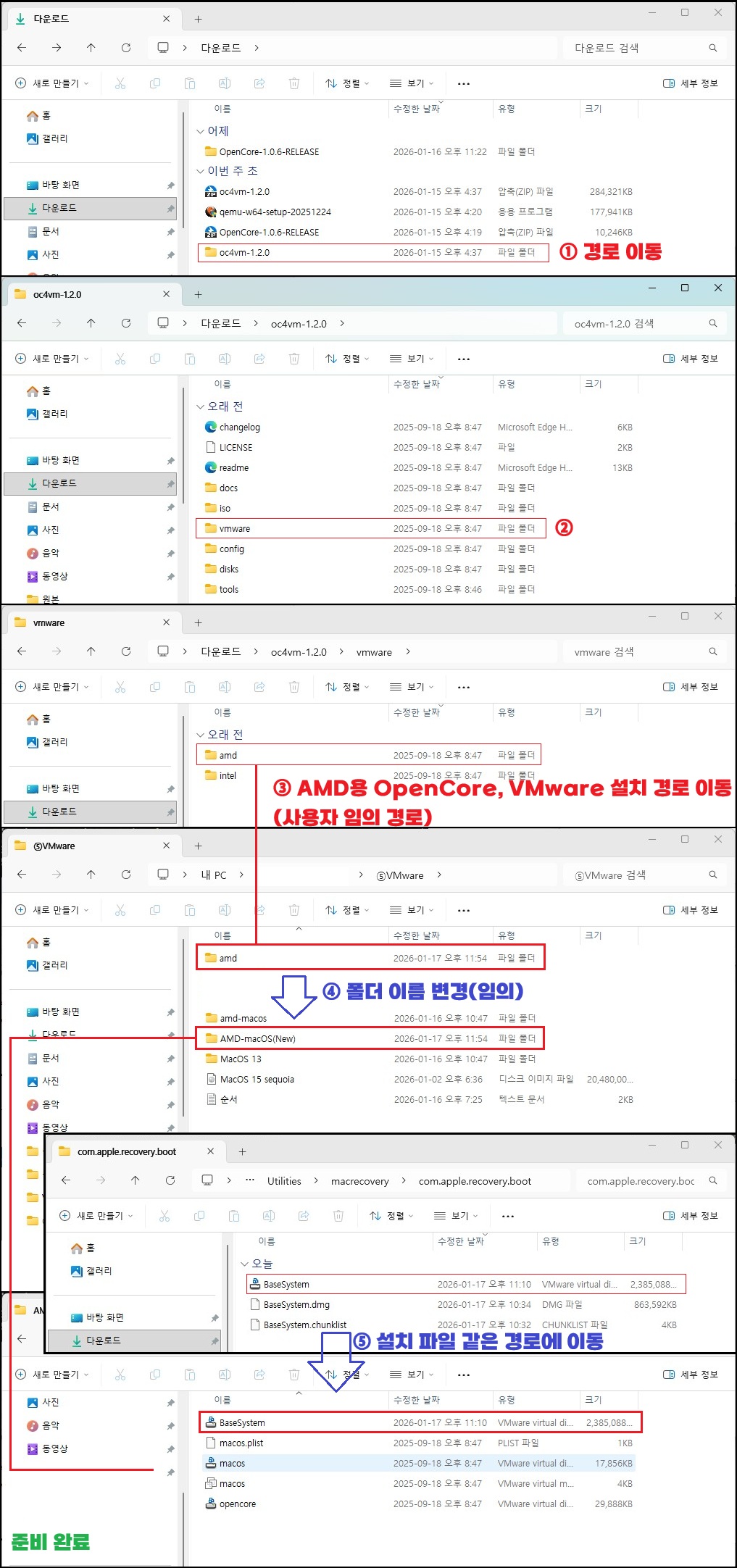 ① oc4vm-1.2.0 경로 이동 → ② vmware → ③ AMD용 OpenCore를 VMware 설치 경로에 이동 또는 복사(임의 경로) → ④ 폴더 이름 변경(임의) → ⑤ 위에서 작업 했던 BaseSystem.vmdk 설치 파일을 같은 경로에 이동 → 설치 준비 완료