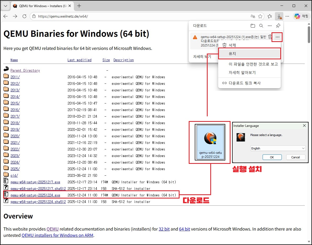 Qemu Windows용 최신 버전을 다운로드하시면 됩니다. 「.EXE」 실행 설치 파일이기 때문에, 요즘 브라우저에서는 대부분 위험 파일로 인식합니다. 브라우저마다 더 보기 → 유지하여 다운로드 같은 옵션을 선택해 주셔야 하고, 백신 프로그램에서도 동일하게 차단하는 경우가 많습니다. 이럴 때는 해당 파일을 예외 처리하거나, 설치하는 동안만 백신을 잠시 중지한 뒤 실행하시면 문제없이 진행할 수 있습니다.