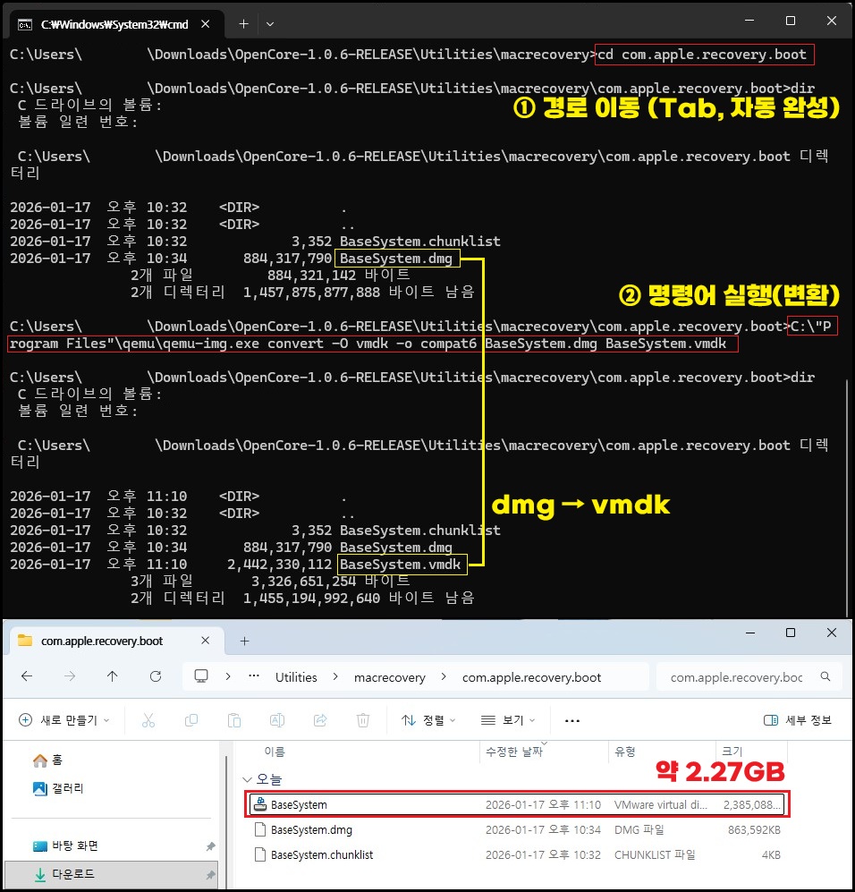 ① cd com.apple.recovery.boot (경로 이동, Tab 자동 완성 이용) → ② Qemu Tool를 이용해 명령어 복사 붙여 넣기 실행 → ③ BaseSystem.vmdk 변환 생성 확인(약 2.27GB)
