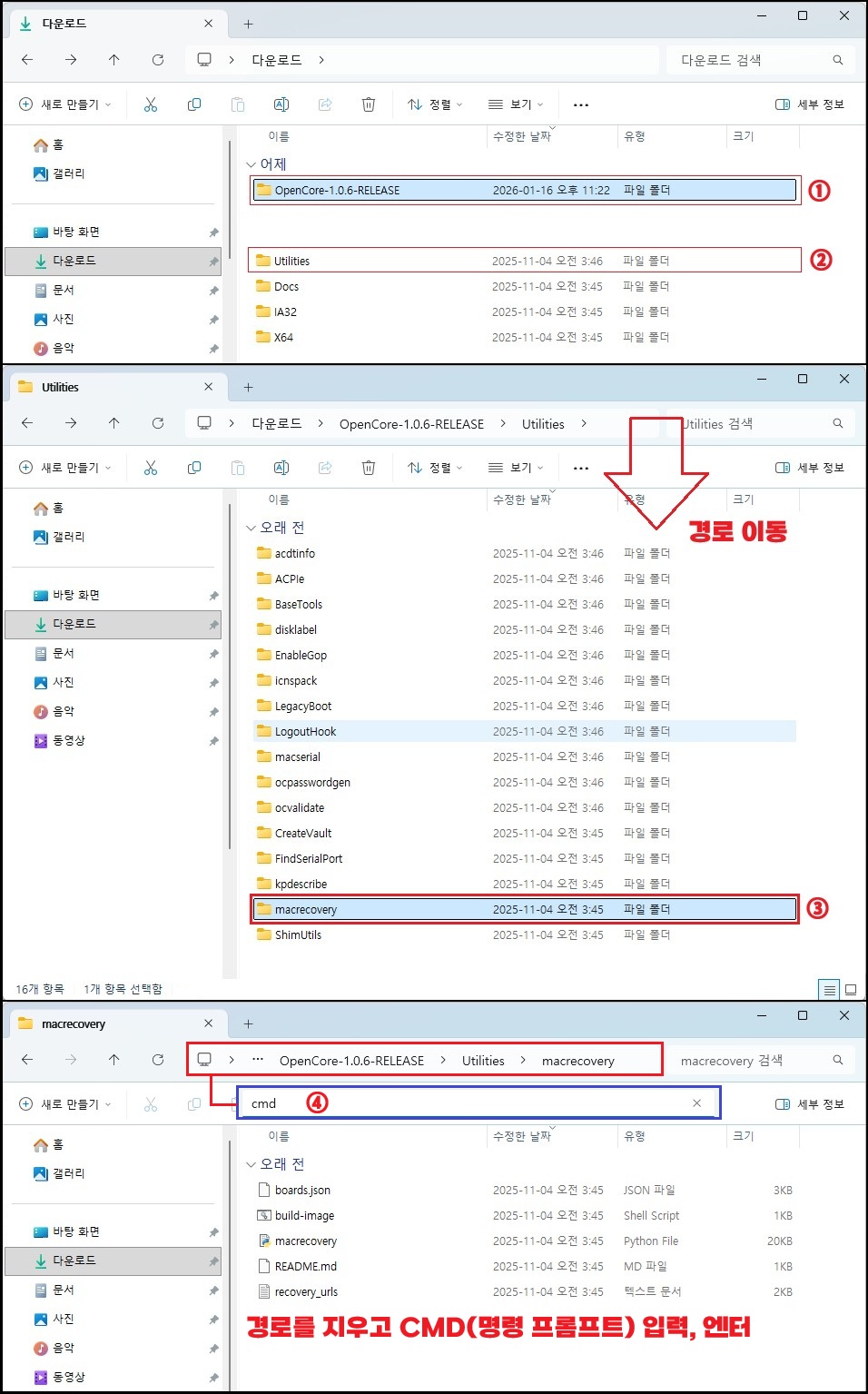 ① OpenCore-1.0.6-RELEASE 폴더 이동 → ② Utilities → ③ macrecovery → ④ 경로를 지우고 CMD(명령 프롬프트) 입력 후 엔터 → ⑤ 위 Python 3 명령어 실행 → ⑥ 레거시 설치 파일 다운로드 생성 확인(약 843MB) → 아직 명령 프롬프트를 종료하지 말고 대기