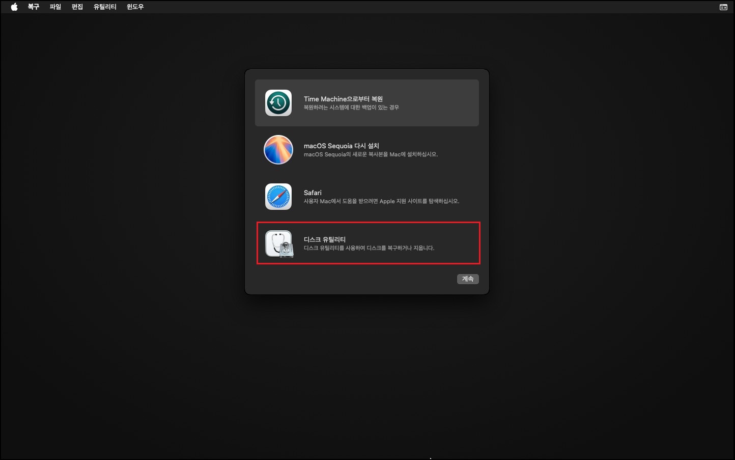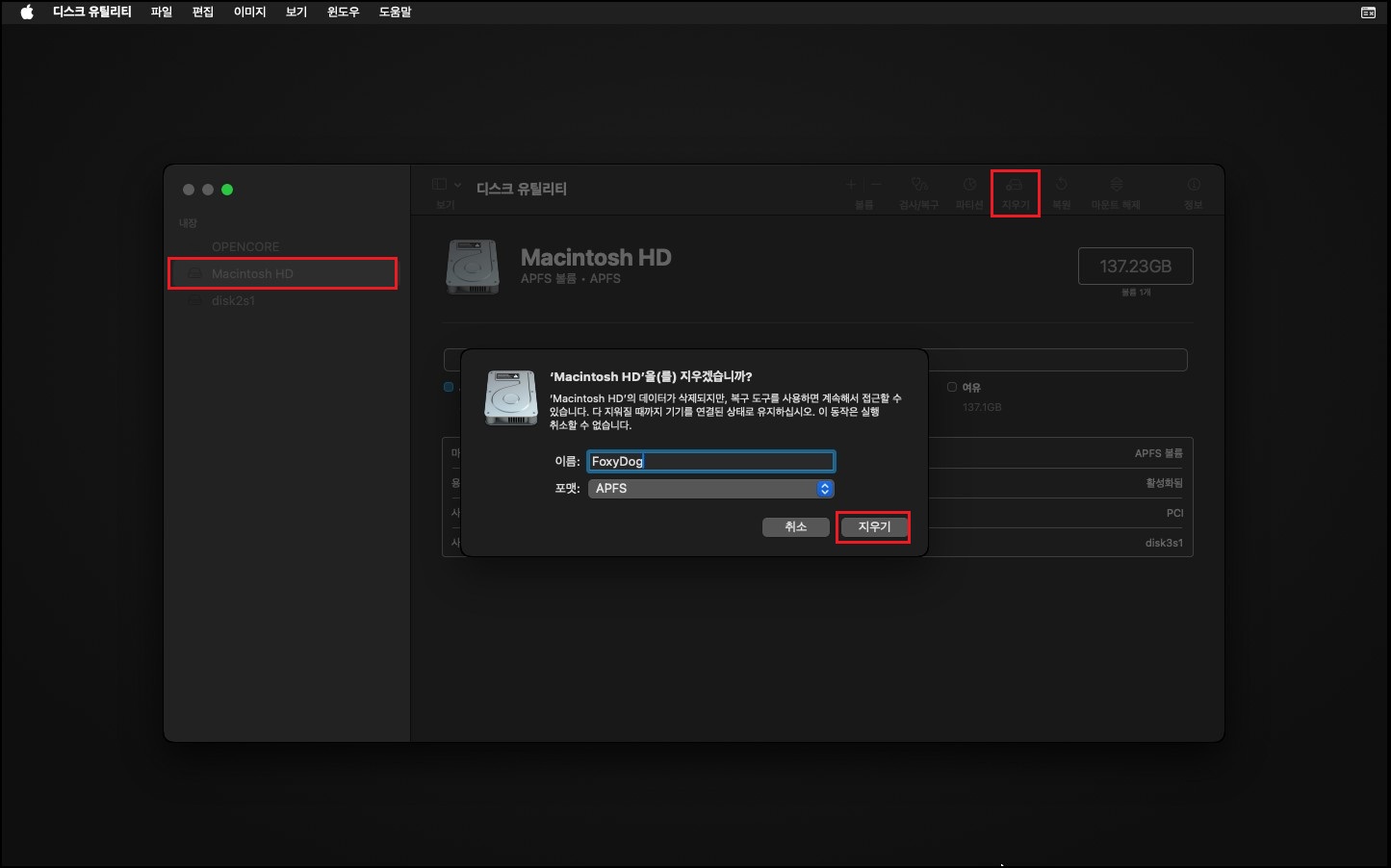 여기까지 진행하셨다면 사실상 준비 단계는 모두 끝났습니다. 이후 과정은 macOS 일반 설치 과정과 동일하므로, 기존에 정리한 포스팅(177)을 참고하시면 됩니다. 설치 전에 한 가지 꼭 필요한 작업이 있는데, 디스크 유틸리티에서 기존 가상 디스크를 삭제, 포맷을 먼저 진행해야 정상적으로 다음 설치 단계로 넘어갈 수 있습니다.