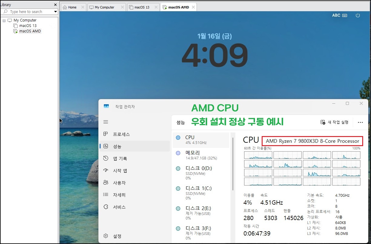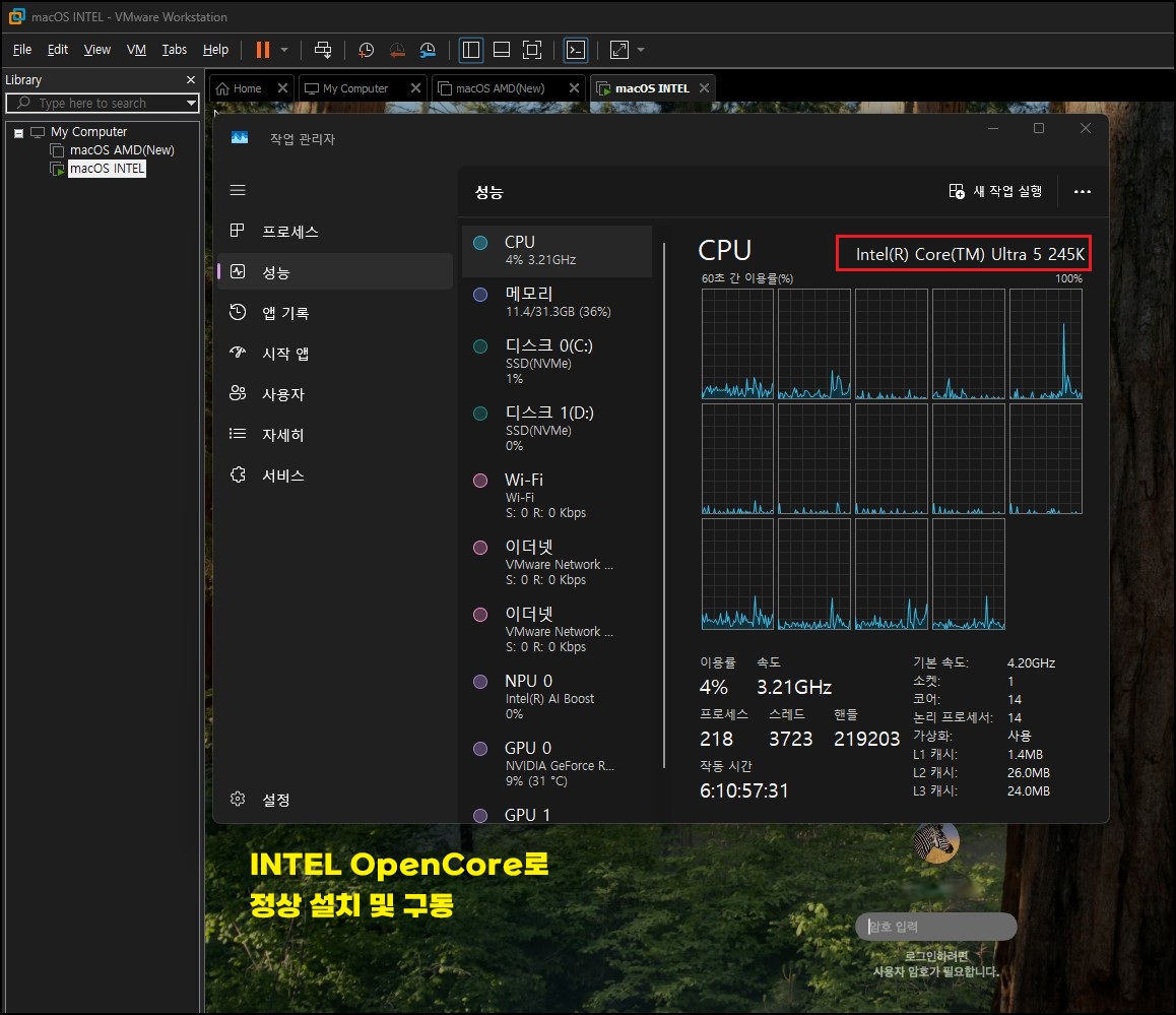 ※ Tahoe, 26 업데이트 지원이 가능하지만, 동작이 느리고 Liquid Glass(macOS 전용 그래픽 사용자 인터페이스, GUI) 효과는 가상화 환경에서 게스트 GPU(Guest GPU)가 없어 효과가 없습니다.