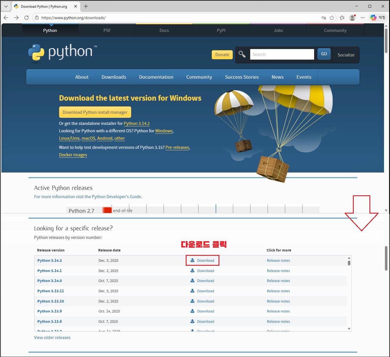 필자는 이미 WebUI 사용으로 Python 3.10.6 구버전이 설치되어 있는 상태였습니다. 미리 테스트해 본 결과, 해당 버전에서도 진행에 전혀 문제가 없었기 때문에 그 이상의 버전이라면 역시 무리 없이 사용할 수 있을 것으로 보입니다. 작성 기준(2026-01-16)으로 안정화 릴리즈 버전은 「Python 3.14.2 (2025-12-05)」이며, 공식 페이지에서 Download를 클릭한 뒤 아래와 같은 방식으로 다운로드 및 설치를 진행하시면 됩니다.