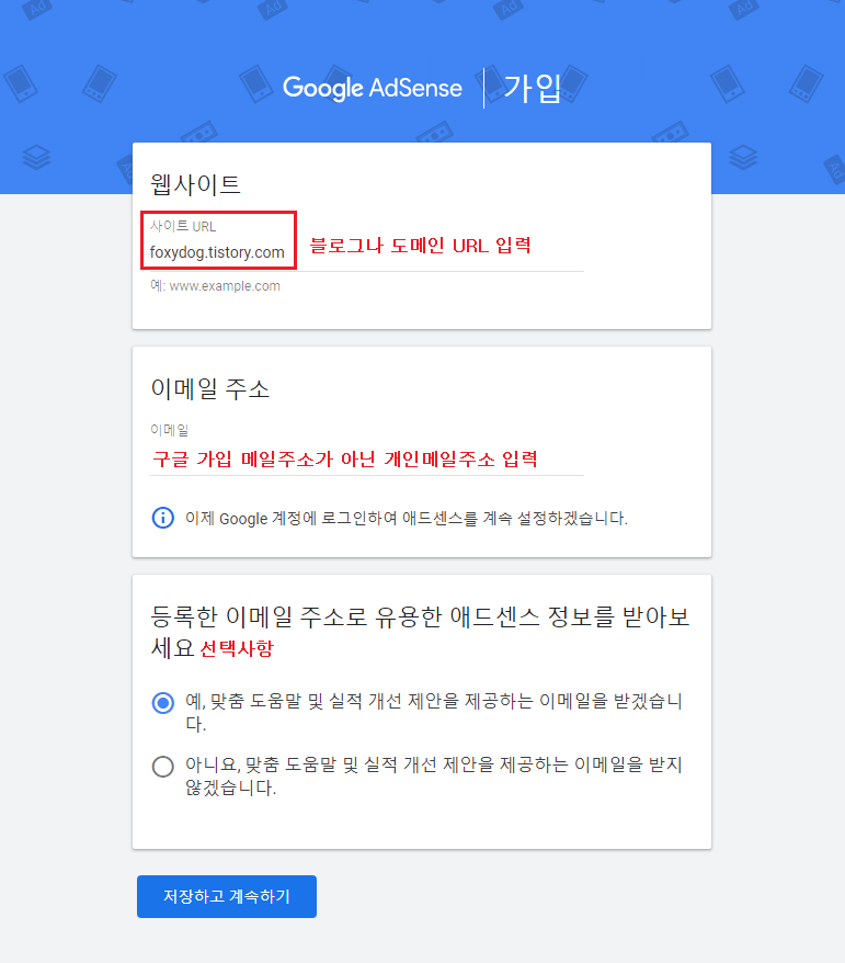 이용하는 블로그나 홈페이지 도메인 주소 입력 [정보 입력] ▶ [저장하고 계속하기]