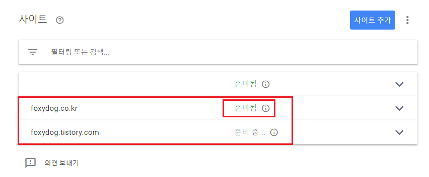 저의 경우는 티스토리 도메인[foxydog.tistory.com]과 2차 도메인[foxydog.co.kr]을 연결한 두 개가 있습니다.