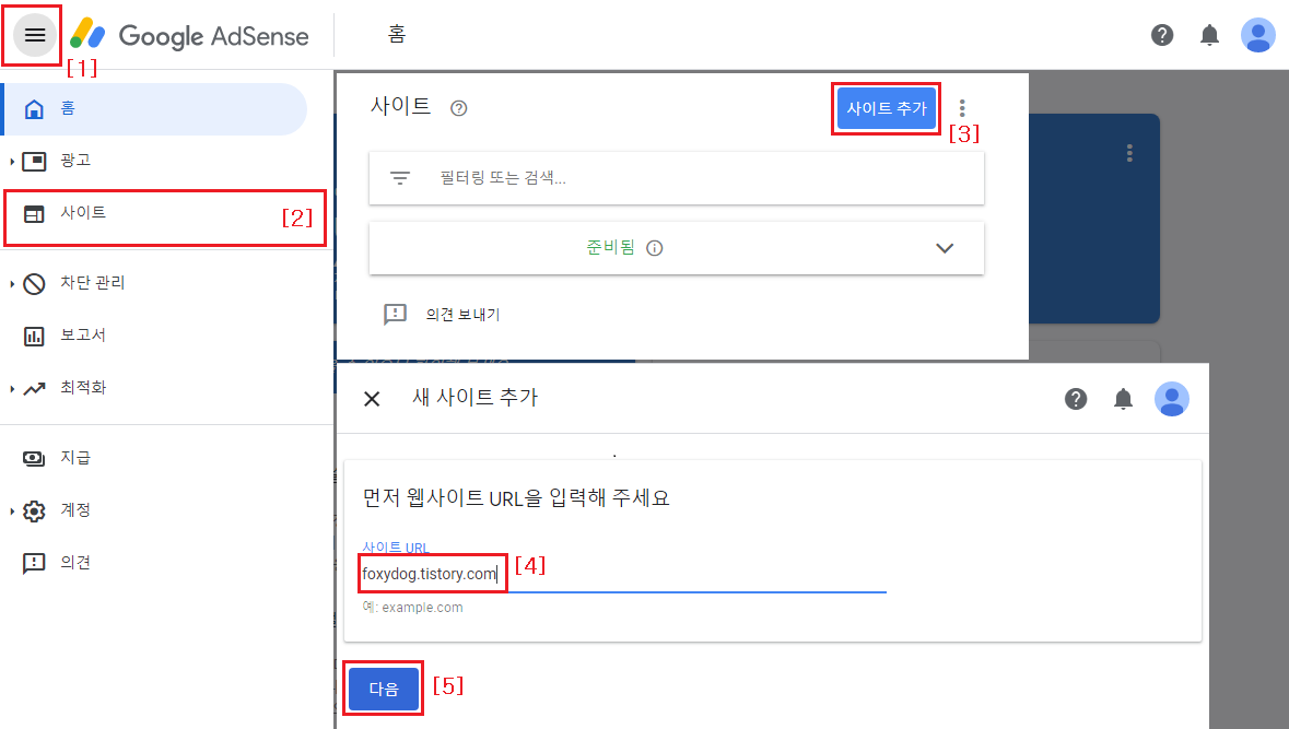 ※ 만약 이미 구글 애드센스를 이용 중이며 추가로 등록할 경우는 다음과 같은 순서로 진행