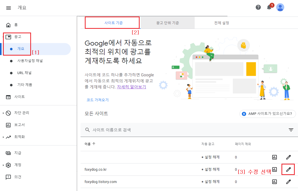 8-1 광고[개요] ▶ [사이트 기준] ▶ 자동 광고를 할 도메인 선택 후 [수정] 선택