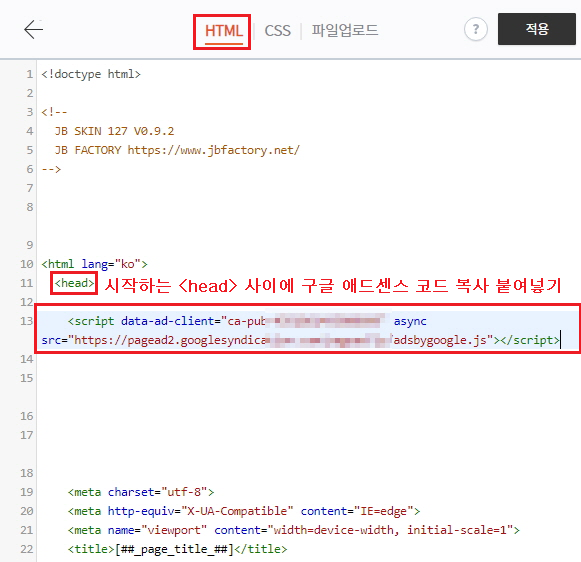 티스토리 개인 운영 [관리자] ▶ [꾸미기] ▶ [스킨 편집] ▶ [HTML 편집] ▶ [코드 복사 붙여 넣기] ▶ [적용]