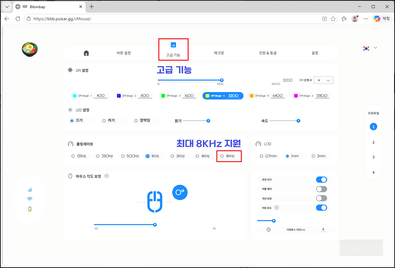 기본 센서는 1000Hz / 1ms 폴링레이트로 설정되어 있으며, 어떤 환경에서도 무난하게 사용할 수 있고 배터리 지속 시간도 적당히 오래 유지될 것으로 보입니다. 최대 8KHz까지 지원하지만, 반응 속도가 빨라지는 만큼 배터리 소모도 빠르게 증가할 것으로 예상됩니다.