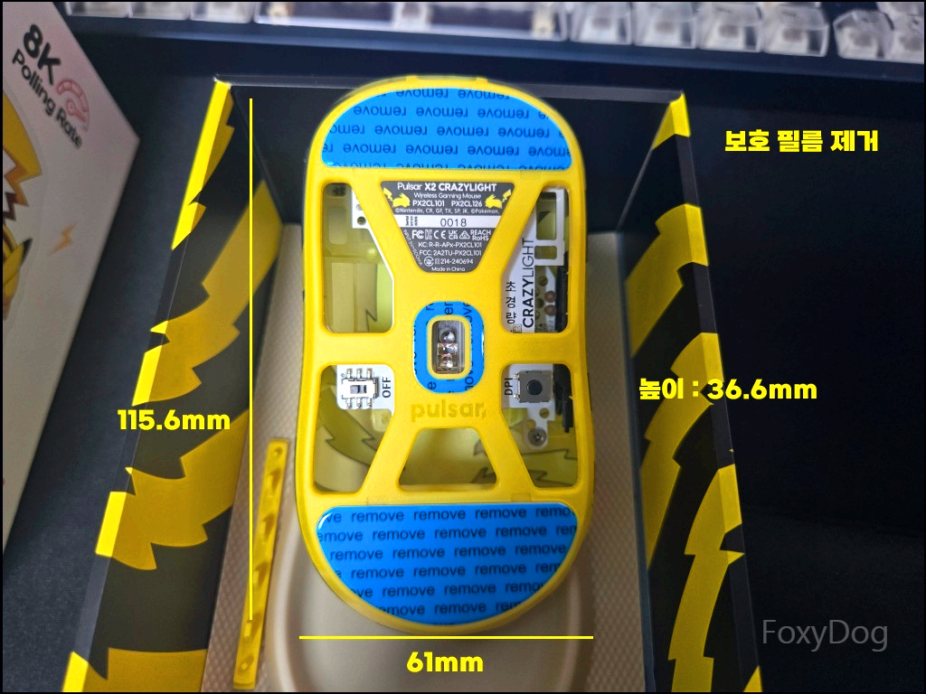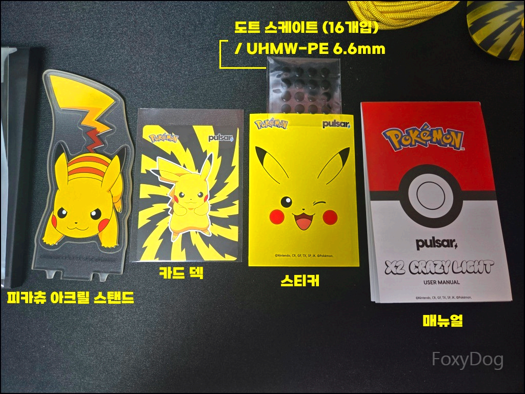 구성품은 X2 CrazyLight 미니 마우스(피카츄), 2버튼 8K 무선 동글, USB-C 케이블, 도트 스케이트(UHMW-PE 6.6mm / 16개입), 피카츄 아크릴 스탠드, 카드 덱, 스티커, 매뉴얼로 구성되어 있습니다. 단순한 마우스 패키지라고 보기 어려울 정도로 구성품에 상당히 공을 들인 것이 느껴집니다. 실제로 사진을 찍어보니 노란색과 검은색의 대비가 은근히 잘 어울리고, 전체적인 색감도 생각보다 촌스럽지 않고 꽤 세련된 느낌을 줍니다.