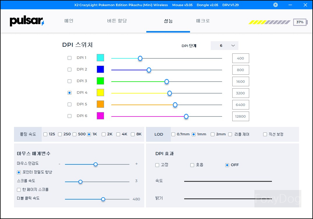 제 생각에는 FHD(1920x1080) 24~27인치 사용자는 DPI (1600), QHD(2560x1440) 32인치 이상이라면 DPI (3200)을 많이 사용할 것 같습니다. 그 외에는 너무 느리거나 빨라서 사용하시는 분들이 있을지 궁금합니다. 하드코어 FPS 사용자분들은 DPI (6,400)까지는 사용할 것 같네요.