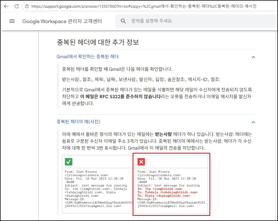 자료를 추가로 찾아보니 (고급/보안)Gmail 공식 문서에도 동일한 내용이 명시되어 있었습니다. 해당 문서에서는 메일 헤더 구조와 RFC 규격 위반 사례에 대해 비교적 자세하게 설명하고 있어, 한 번쯤 정독해 보시면 이번과 같은 리턴 메시지뿐만 아니라 다양한 메일 반송 오류에 보다 유연하게 대응하는 데 도움이 될 것으로 보입니다.