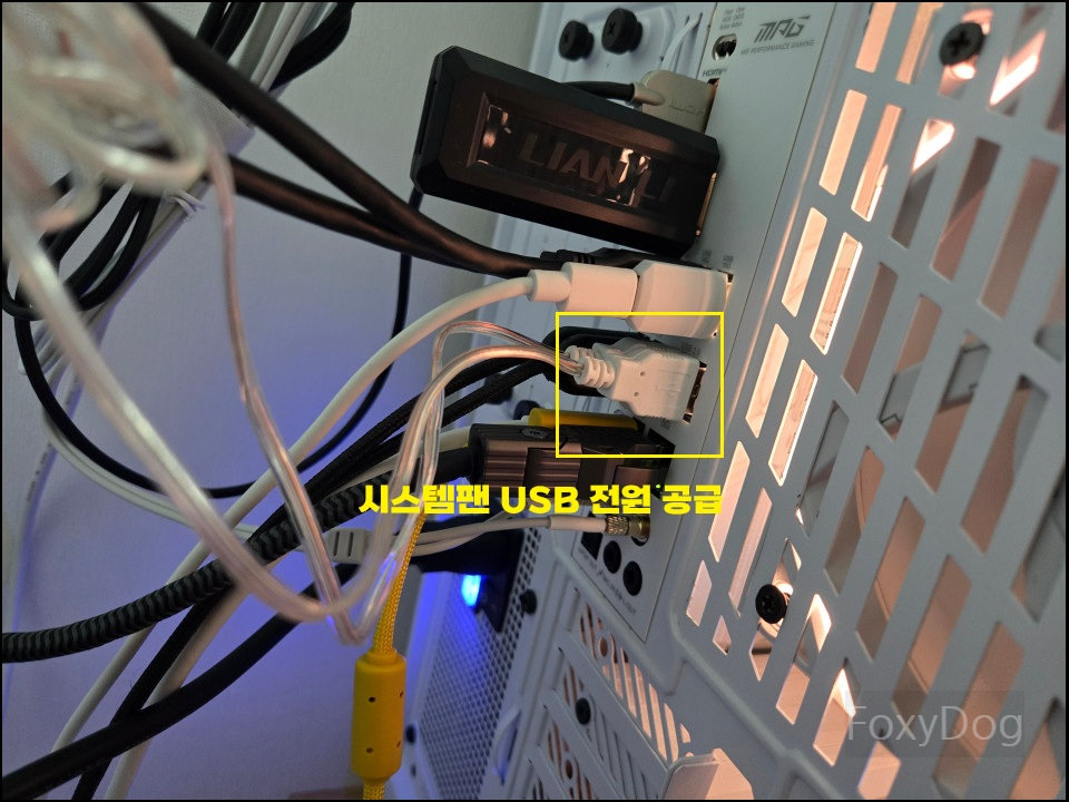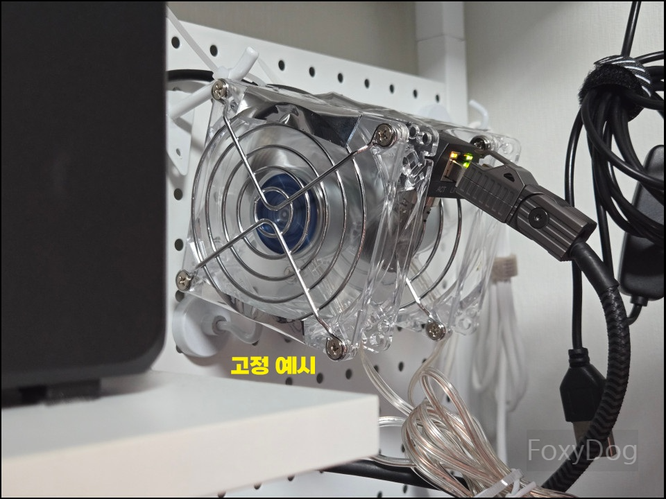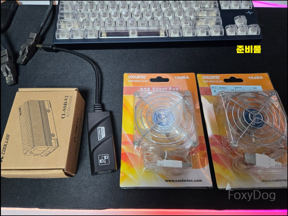 M.2 SSD 쿨러는 예전에 알리에서 구입해 이미 가지고 있던 제품이고, 쿨링을 극대화 하기 위해 USB 시스템쿨러(80mm) 2개를 양쪽에서 감싸 고정했습니다. 이렇게 개조를 하다보니 스스로도 조금 어이없는 웃음이 나오긴 하네요. 사실 USB 랜카드가 위아래가 평평한 구조였다면 히트싱크를 양쪽으로 붙이는 것도 가능했을 것 같다는 생각이 들었습니다. 이건 조금 과한 튜닝일 수도 있겠죠...? 이럴 바에는 차다리 비용을 조금 더 투자해서 알루미늄 재질의 랜카드를 구매하는 것을 추천드립니다.