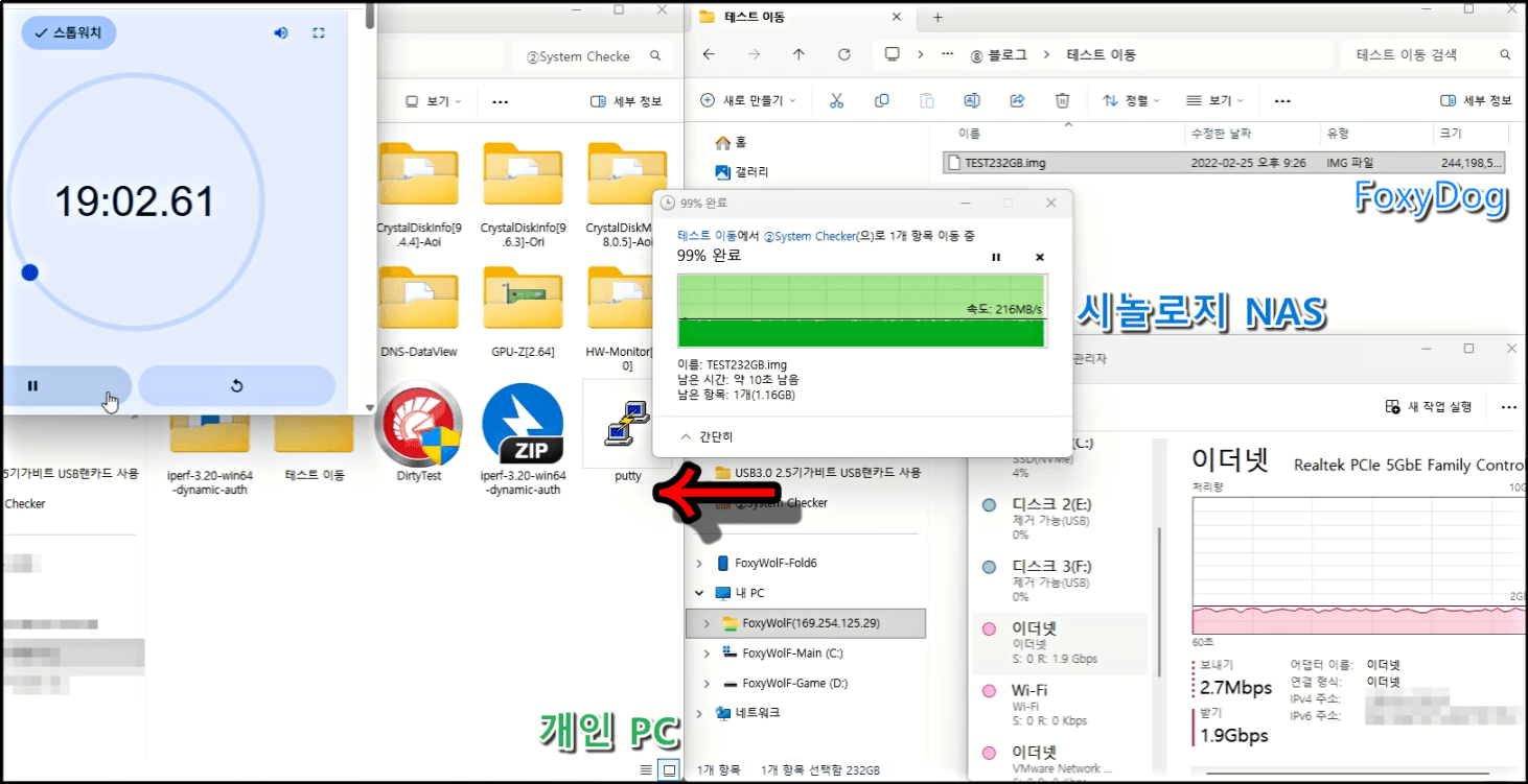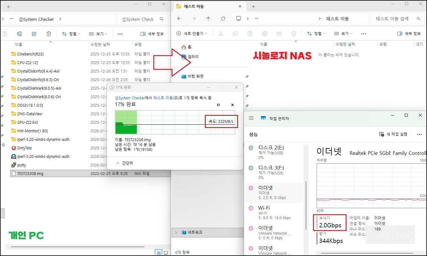 경로 : 개인 PC 유선 랜(5Gbps) → 시놀로지 NAS 유선 랜(1Gbps)