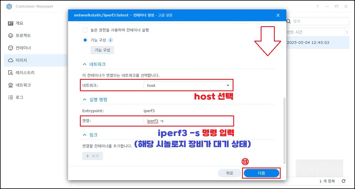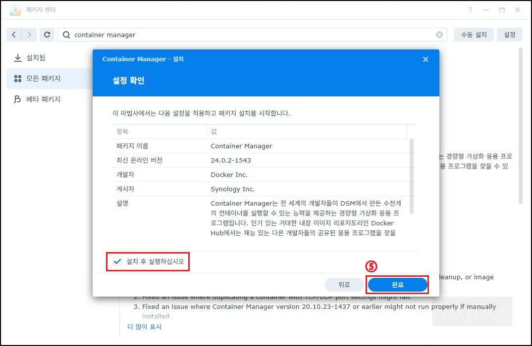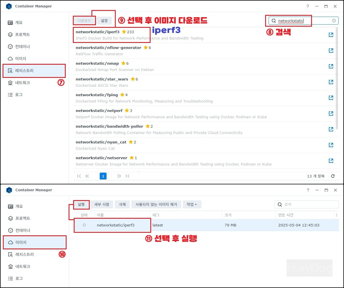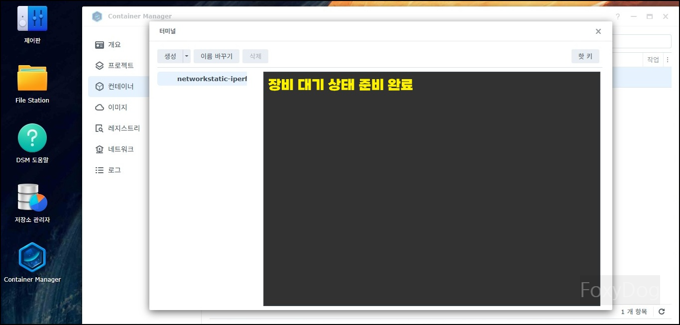 패키지 센터에 다음과 같이 검색을 합니다. "Container Manager는 전 세계의 개발자들이 DSM에서 만든 수천 개의 컨테이너를 실행할 수 있는 능력을 제공하는 경량형 가상화 응용 프로그램입니다. 인기 있는 거대한 내장 이미지 리포지토리인 Docker Hub에서는 재능 있는 다른 개발자들의 공유된 응용 프로그램을 찾을 수 있습니다." 설명 내용이며, 컨테이너 안에 우리가 원하는 iPerf3 tool이 포함되어 있습니다.