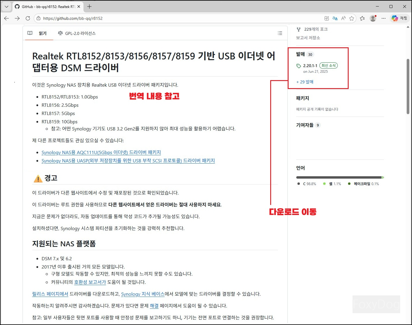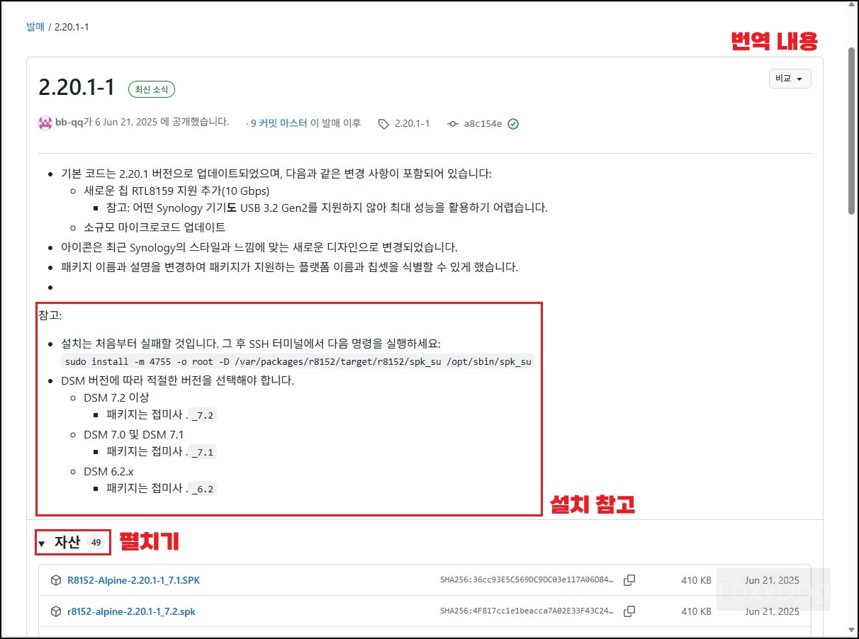 (포스팅 작성 시점에 사전 출시가 되었으나 최신이라고 무조건 좋은 것은 아닙니다. 저는 2.20.1-1으로 설치를 하였으나 최신 버전도 설치 방법은 똑같습니다. 다른 점이라면 TX의 흐름 제어 개선과 DSM 7.3 이상 버전을 지원합니다.)