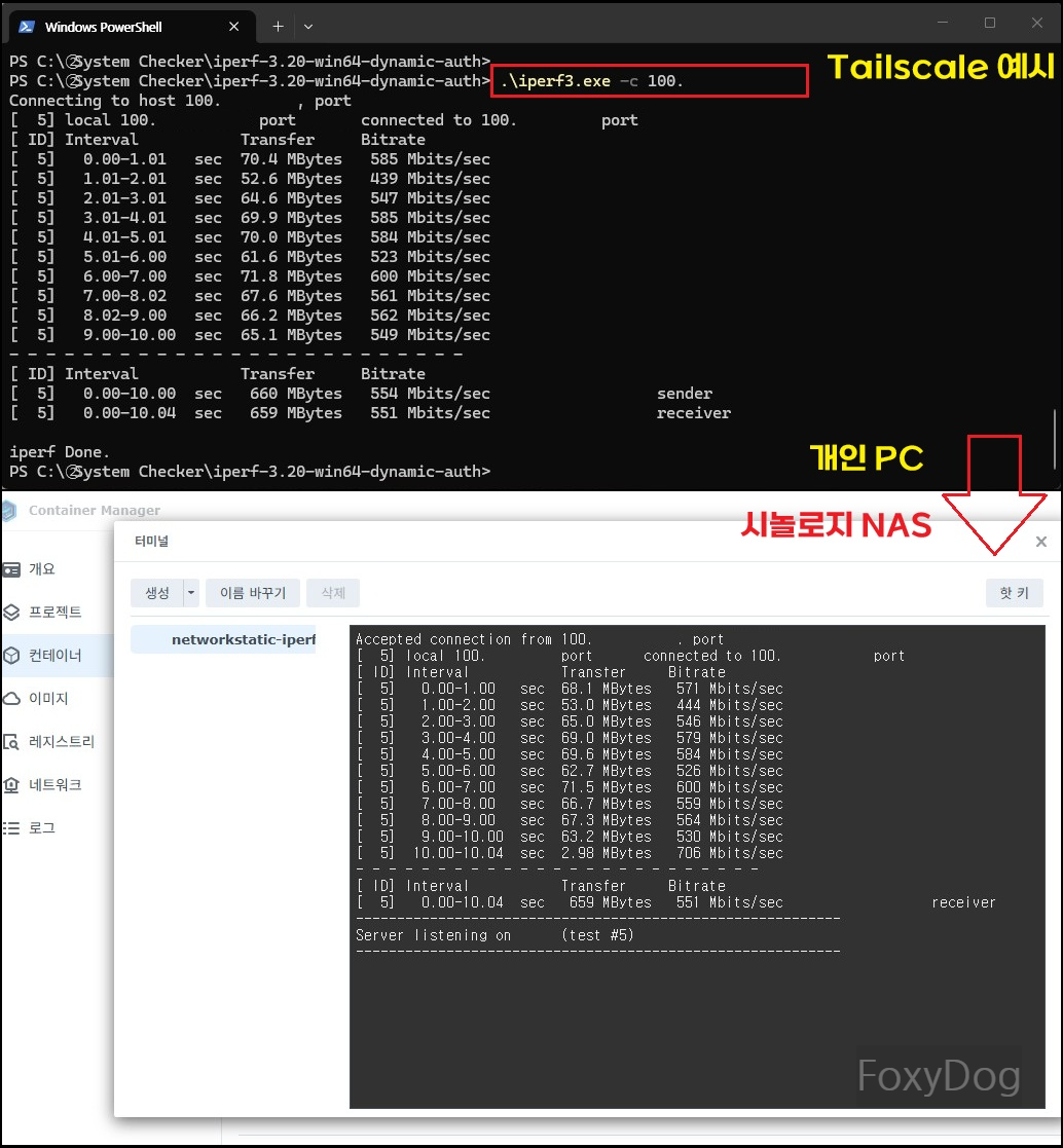 # iperf3 -c 100.xxx.xxx.xxx (여기서는 시놀로지 NAS에 세팅된 Tailscale 사설 IP 입력)