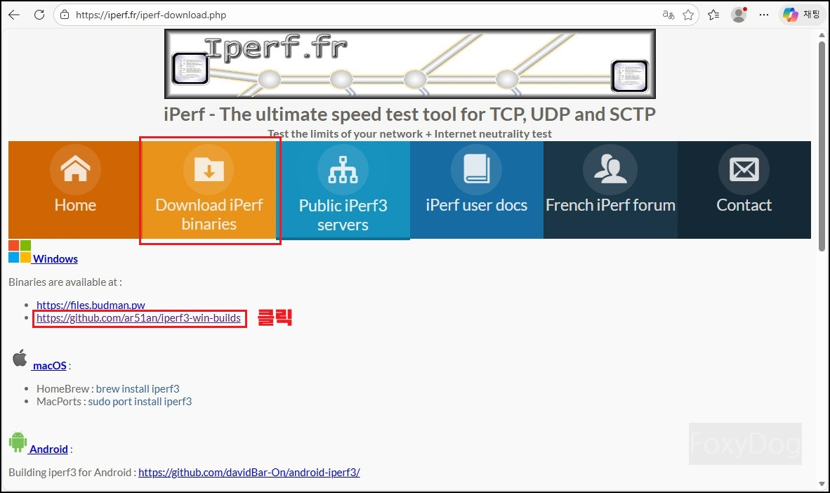 공식 홈페이지 다운로드 페이지를 따라가면 iPerf3 Tool을 제공하는 별도의 사이트로 안내됩니다. Windows뿐만 아니라 macOS, Android, Ubuntu / Debian / Mint 계열, Fedora / Red Hat / CentOS / Rocky 계열, FreeBSD 등 다양한 운영체제에서 사용할 수 있습니다.