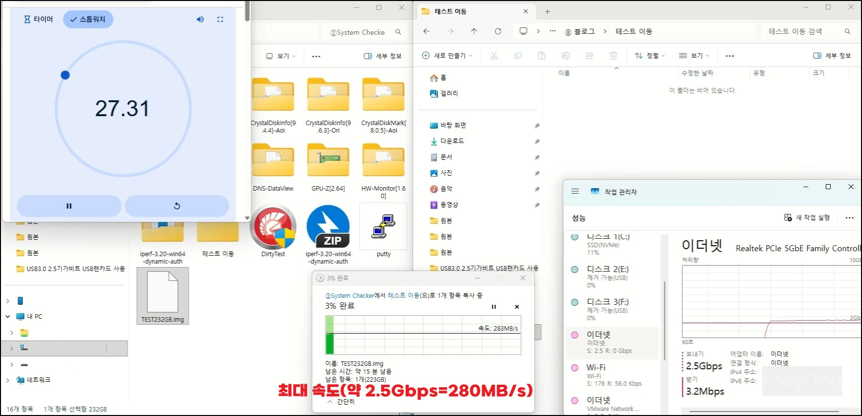 결과적으로 개인 PC와 시놀로지 NAS 사이의 전송 구간을 2.5Gpbs 속도로 충분히 활용할 수 있게 되었으며, 초기에는 발열에 의한 쓰로틀링을 의심했지만 실제로는 HDD의 지속 쓰기 특성에 따른 자연스러운 속도 전환으로 판단됩니다.