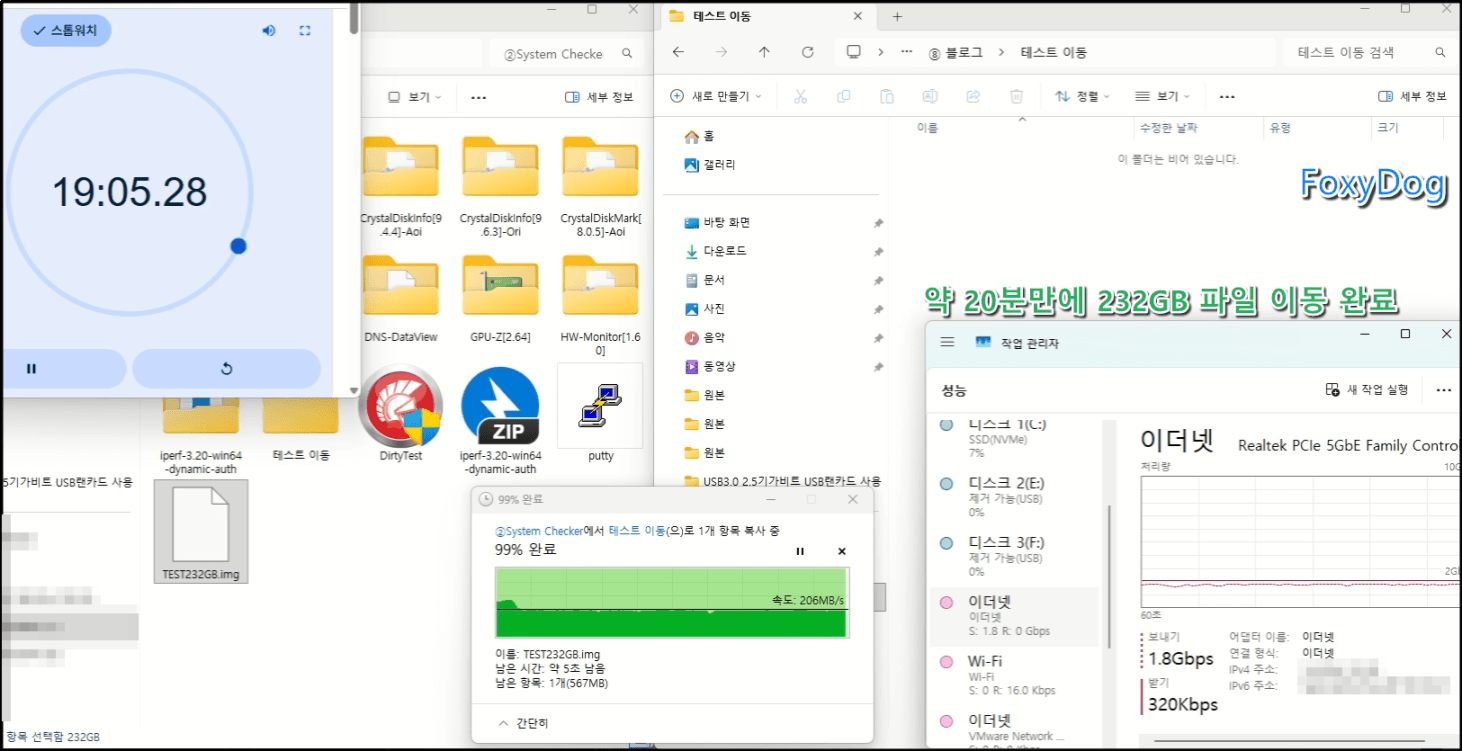처음에는 280MB/s 근사치로 나오다가 1분내로 쓰로틀링이 걸리면서 평균 2.0Gbps(약 200MB/s)으로 꾸준히 전송 처리를 완료 하였습니다. 기존 보다 2배 이상 속도가 나와서 좀 더 빠른 데이터를 주고 받을 수 있는 구성이 되었습니다. 아직 좀 더 테스트 해보고 싶은 상황이 남아 있는데, USB 랜 카드에 SSD Coolor를 알루미늄 테이프로 감은뒤에 USB용 시스템 팬을 직접 쿨링해주면 쓰로틀링 없이 꾸준히 처리가 가능한지? 물건이 오면 바로 테스트 예정입니다.