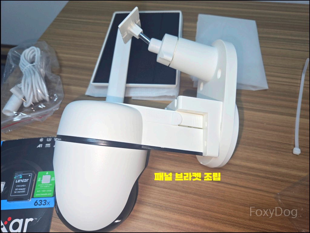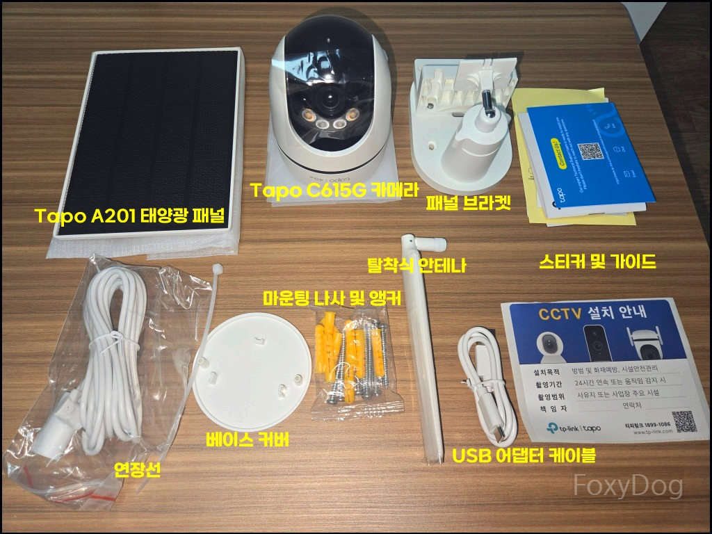 사진으로 보면 작아 보이지만 실제로는 생각보다 제품 크기도 있고 구성품도 제법 많습니다. 구성은 메인 Tapo C615G 카메라와 Tapo A201 태양광 패널이 기본이며, 그 외에도 태양광 패널 브라켓, 베이스 커버, 탈착식 안테나, 마운팅 나사 및 앵커, 연장선, USB 어댑터 케이블, 스티커, 시작 가이드까지 포함되어 있습니다.