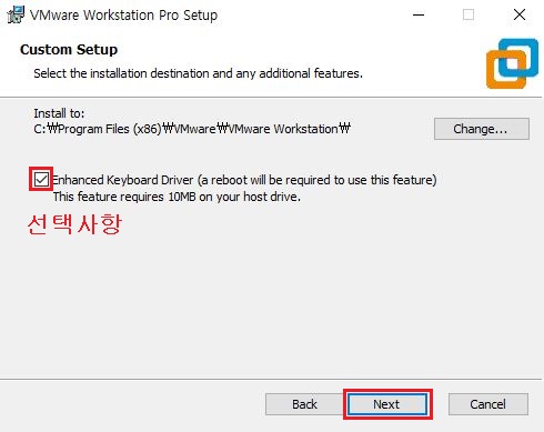 개선된 키보드 드라이버 설치 여부를 물어보는데 처음 보는 메뉴입니다. 정확히는 모르겠지만 VM 내부에서 좀 더 나은 키보드 환경을 제공하는 것으로 보면 될 것 같습니다. 설치하는데 10MB밖에 안 든다고 하니 설치해서 나쁠 것 없겠죠.