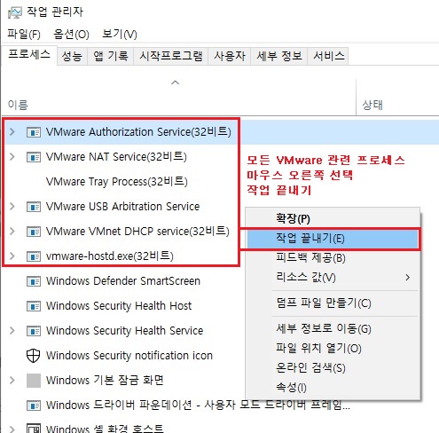 예시) 작업관리자 실행[이미지 참고] 후 VMware 관련된 모든 프로세스 중지하기