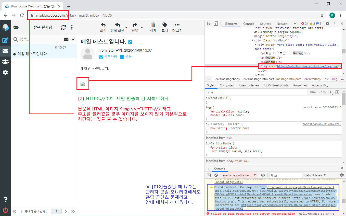 최근 들어 호스팅 서비스 문의가 많아진 것 중 하나가 웹 브라우저에서 이미지가 뜨지 않는다는 문의입니다. 웹을 통해 보는 모든 서비스가 해당되며 특히 이미지를 많이 사용하는 쇼핑몰 사이트, 광고나 뉴스레터 및 공고문을 많이 보내는 웹메일 서비스에서 많이 발생합니다. 안 뜨는 이유는 여러 가지가 있지만 결론을 바로 말씀드리자면 최근 브라우저를 제공하는 기관들이 HTTPS와 HTTP 혼합 콘텐츠 사용 정책 변경으로 인해 기본적으로 보이지 않게 처리하여 발생하는 문제가 가장 많습니다.