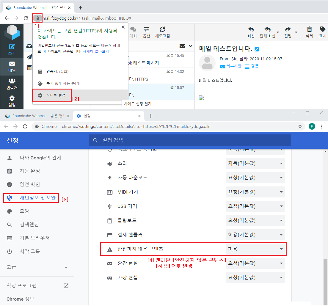 ①자물쇠 모양 클릭 ▷ ②사이트 설정 ▷ ③개인정보 및 보안 ▷ ④안전하지 않은 콘텐츠 [허용]으로 변경