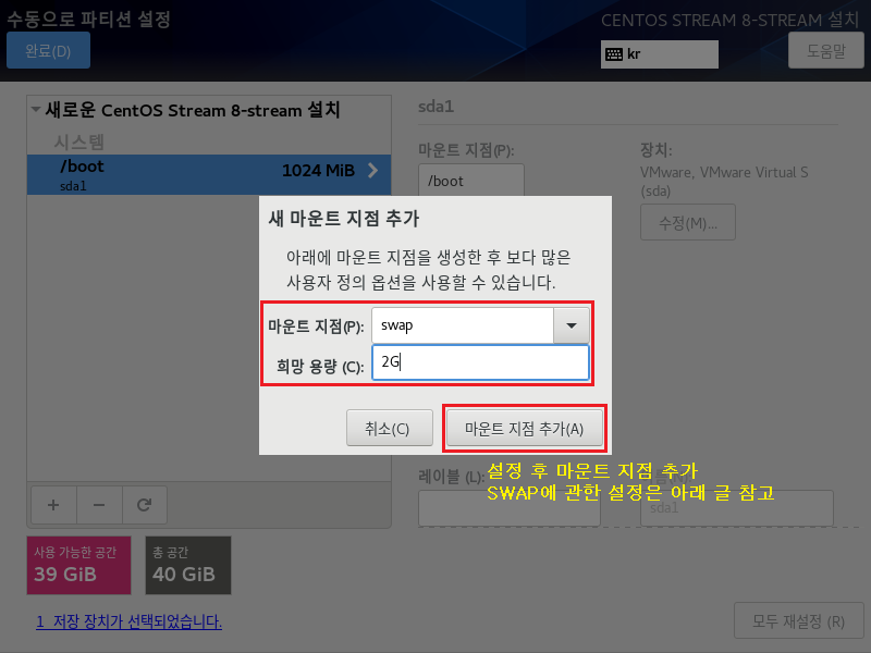 SWAP은 일종의 메모리 확보라고 생각하시면 될듯합니다. 하드디스크의 일부를 마치 메모리처럼 사용할 수 있게 해주는 기술입니다. RAM 메모리가 부족할 때 대신 SWAP 파티션을 잡아두었던 메모리를 사용합니다. 일반적으로 RAM 사용량의 2배 이상 권고 설정이라고 알고 있는 분들도 있으시겠지만 서버의 용도나 실서버 하드웨어에 들어가는 RAM 용량이 얼마냐에 따라 튜닝 작업을 해야 합니다. 하지만 저희는 테스트이며 기본적으로 1~2GB RAM으로 세팅하므로 위 동일하게 하시고 넘어가면 됩니다. 하드디스크의 용량을 사용하기 때문에 충분히 용량을 확인하고 설정하시기 바랍니다.
