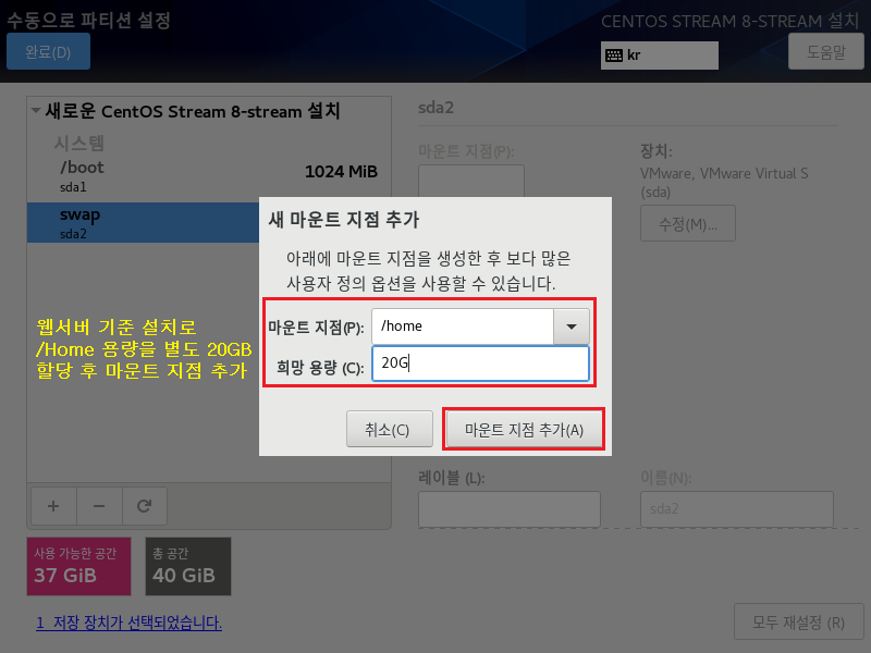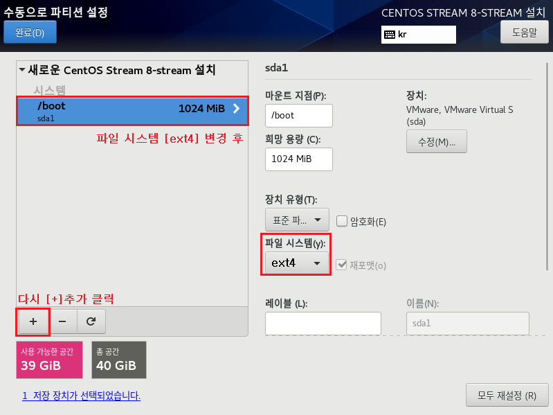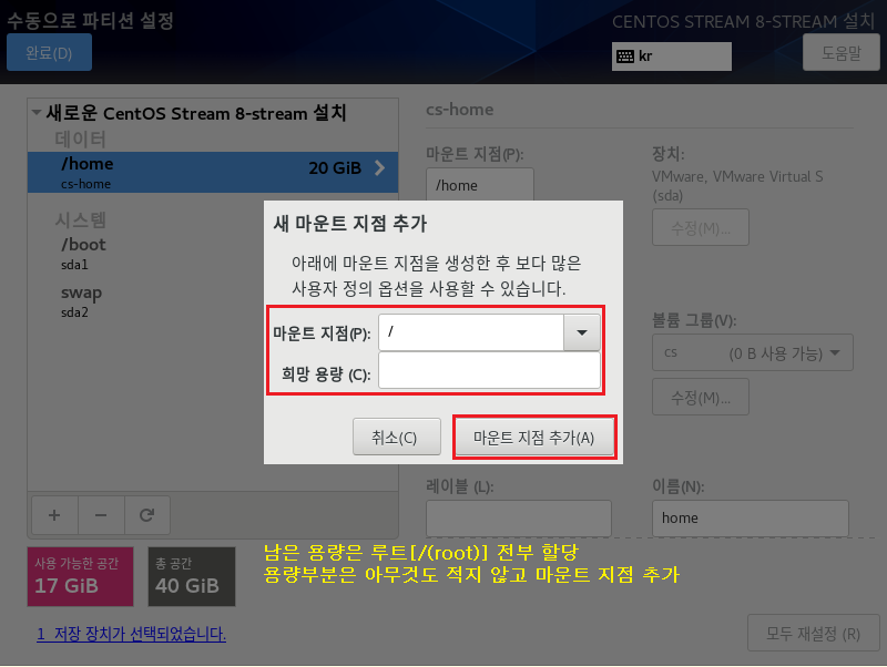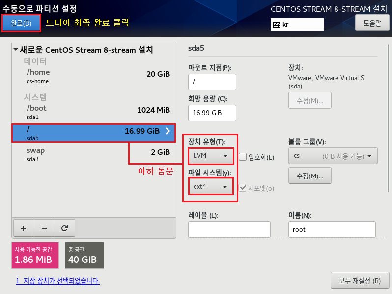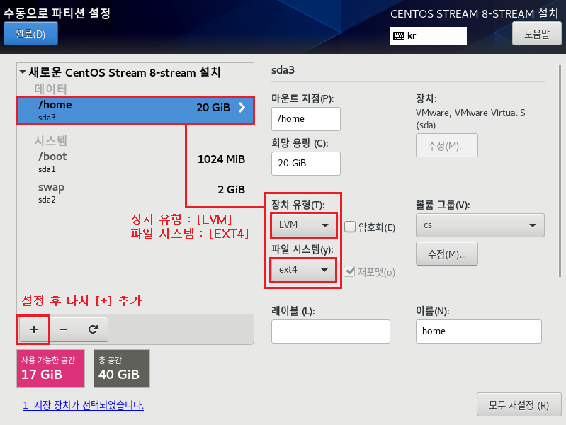 파일 시스템[EXT4] , 장치 유형[LVM]으로 설정하는 이유는 속도나 좀 더 효율적으로 디스크를 사용 및 관리하기 위해서입니다. 이제 가상화 솔루션에서도 많이 안정화되었으며 여러모로 특징이 많으므로 기본적으로 사용하는 게 좋습니다.