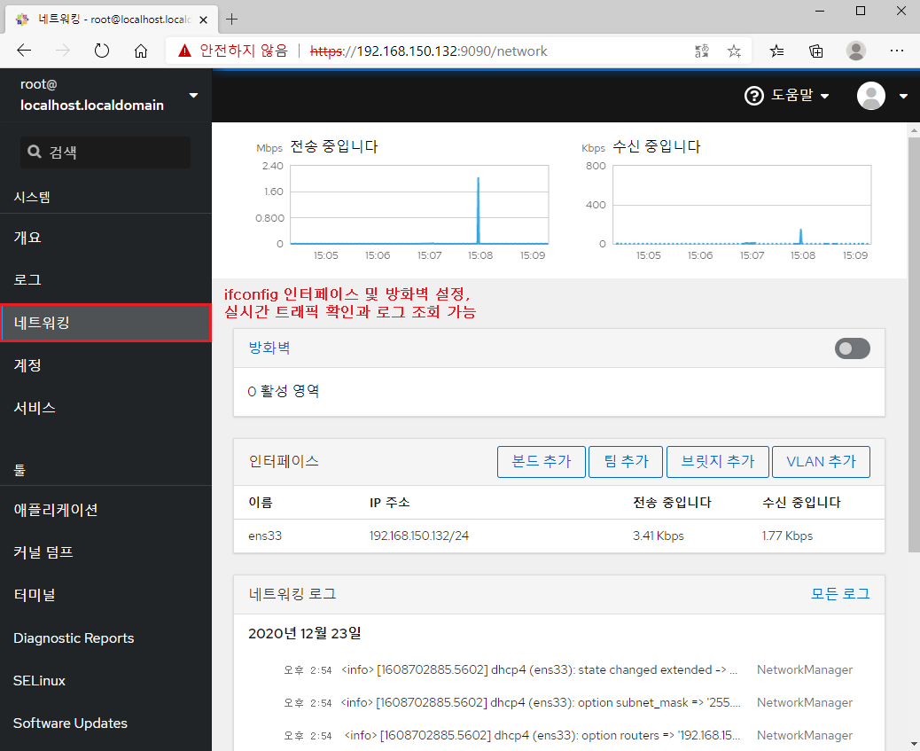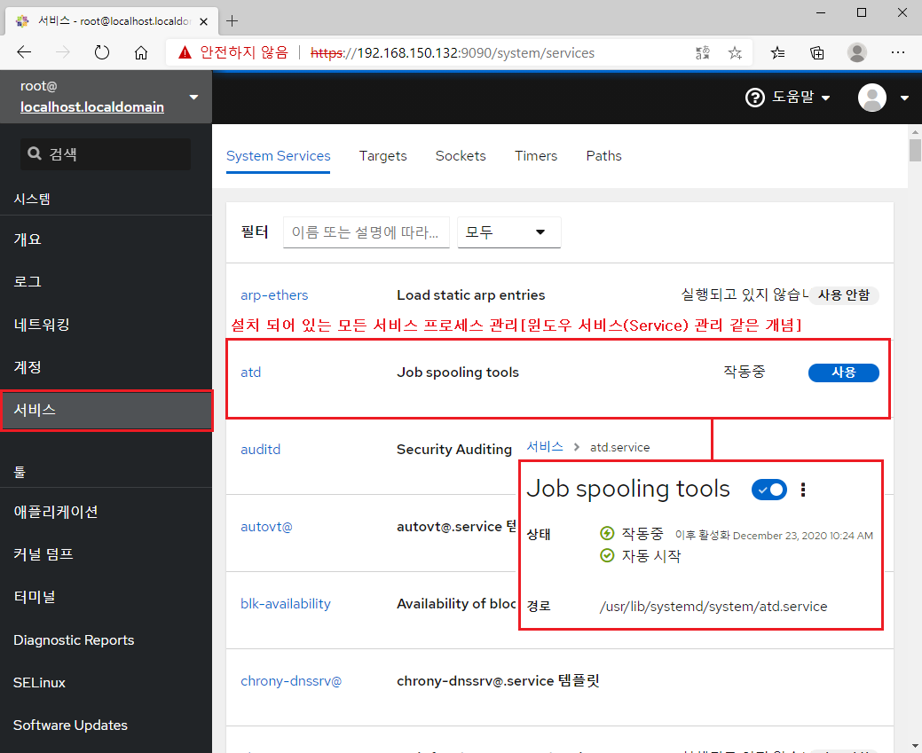 [root@localhost ~]# systemctl enable --now cockpit.socket [자동 시작 활성화 및 프로세스 시작]