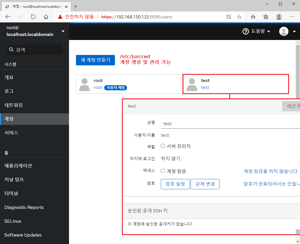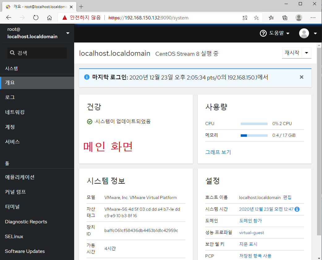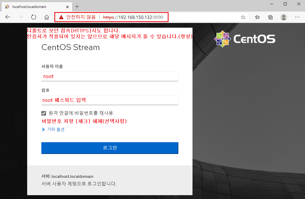 ※ https://localhost:9090 또는 https://192.168.150.132:9090 접속