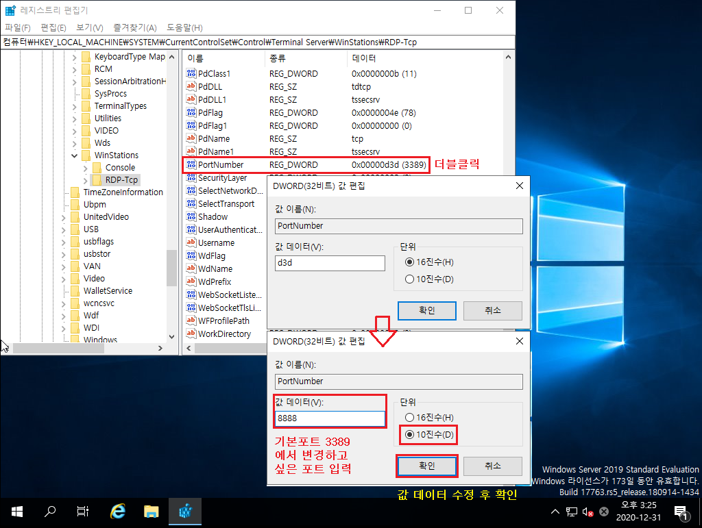 ※ 더블클릭 ▷ 16진수에서 10진수로 변경 ▷ 값 데이터[8888](변경하고 싶은 포트) 입력